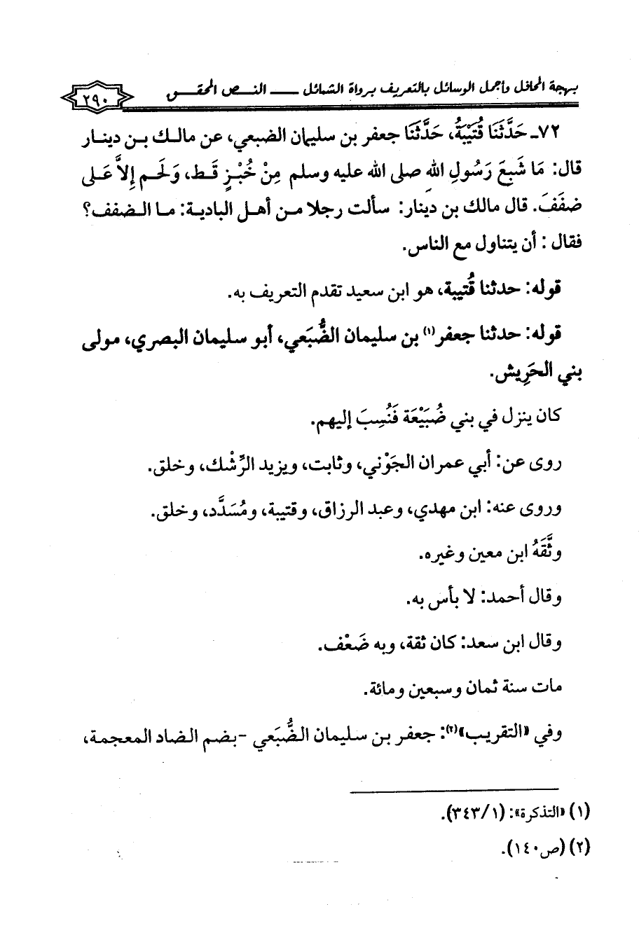 72 - حَدَّثَنَا قُتَيْبَةُ, حَدَّثَنَا جعفر بن سليمان الضبعي, عن مالك بن دينار قال: مَا شَبِعَ رَسُولِ اللهِ صلى الله عليه وسلم مِنْ خُبْزٍ قَط, وَلَحم إِلاَّ عَلى ضفَفَ. قال مالك بن دينار: سألت رجلا من أهل البادية: ما الضفف؟ فقال: أن يتناول مع الناس.