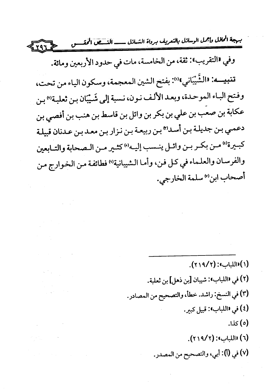تنبيه: «الشَّيْبَاني» (¬1): بفتح الشين المعجمة، وسكون الياء من تحت، وفتح الباء الموحدة، وبعد الألف نون، نسبة إلى شَيْبَان بن ثعلبة (¬2) بن عكابة بن صعب بن علي بن بكر بن وائل بن قاسط بن هنب بن أفصي بن دعمي بن جديلة بن أسد (¬3) بن ربيعة بن نزار بن معد بن عدنان قبيلة كبيرة (¬4) من بكر بن وائل ينسب إليه (¬5) كثير من الصحابة والتابعين والفرسان والعلماء في كل فن، وأما الشيبانية (¬6) فطائفة من الخوارج من أصحاب ابن (¬7) سلمة الخارجي.