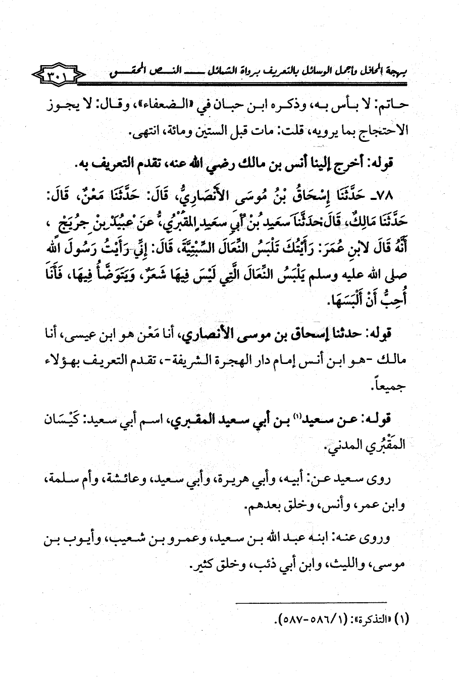 78 - حَدَّثَنَا إِسْحَاقُ بْنُ مُوسَى الأَنْصَارِيُّ، قَالَ: حَدَّثَنَا مَعْنٌ، قَالَ: حَدَّثَنَا مَالِكٌ، قَالَ: حَدَّثَنَا سَعِيدُ بْنُ أَبِي سَعِيدٍ الْمَقْبُرِيُّ، عَنْ عُبَيْدِ بْنِ جُرَيْجٍ، أَنَّهُ قَالَ لابْنِ عُمَرَ: رَأَيْتُكَ تَلْبَسُ النِّعَالَ السِّبْتِيَّةَ، قَالَ: إِنِّي رَأَيْتُ رَسُولَ اللهِ صلى الله عليه وسلم يَلْبَسُ النِّعَالَ الَّتِي لَيْسَ فِيهَا شَعَرٌ، وَيَتَوَضَّأُ فِيهَا، فَأَنَا أُحِبُّ أَنْ أَلْبَسَهَا.