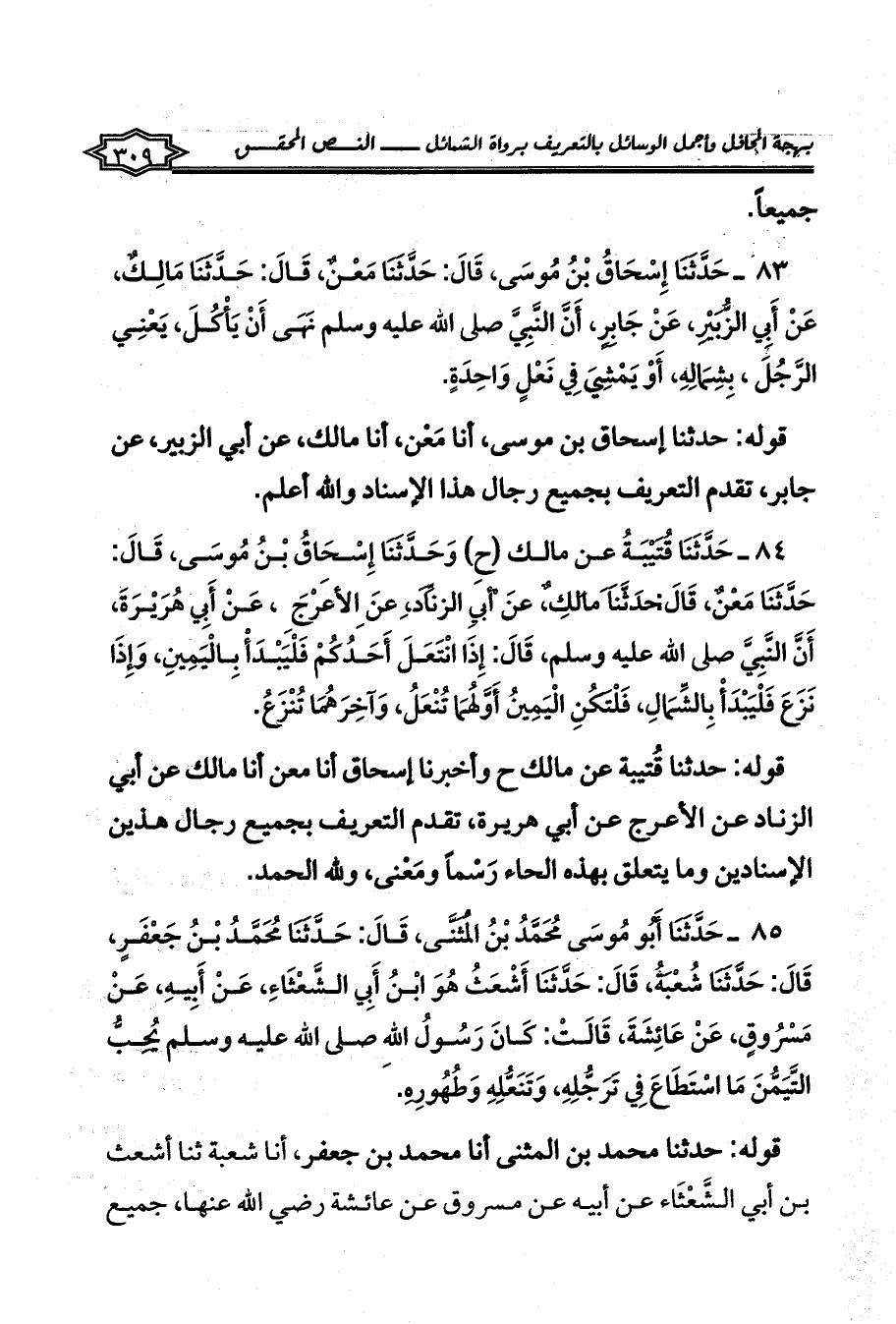 85 - حَدَّثَنَا أَبُو مُوسَى مُحَمَّدُ بْنُ الْمُثَنَّى، قَالَ: حَدَّثَنَا مُحَمَّدُ بْنُ جَعْفَرٍ، قَالَ: حَدَّثَنَا شُعْبَةُ، قَالَ: حَدَّثَنَا أَشْعَثُ هُوَ ابْنُ أَبِي الشَّعْثَاءِ، عَنْ أَبِيهِ، عَنْ مَسْرُوقٍ، عَنْ عَائِشَةَ، قَالَتْ: كَانَ رَسُولُ اللهِ صلى الله عليه وسلم يُحِبُّ التَّيَمُّنَ مَا اسْتَطَاعَ فِي تَرَجُّلِهِ، وَتَنَعُّلِهِ وَطُهُورِهِ.