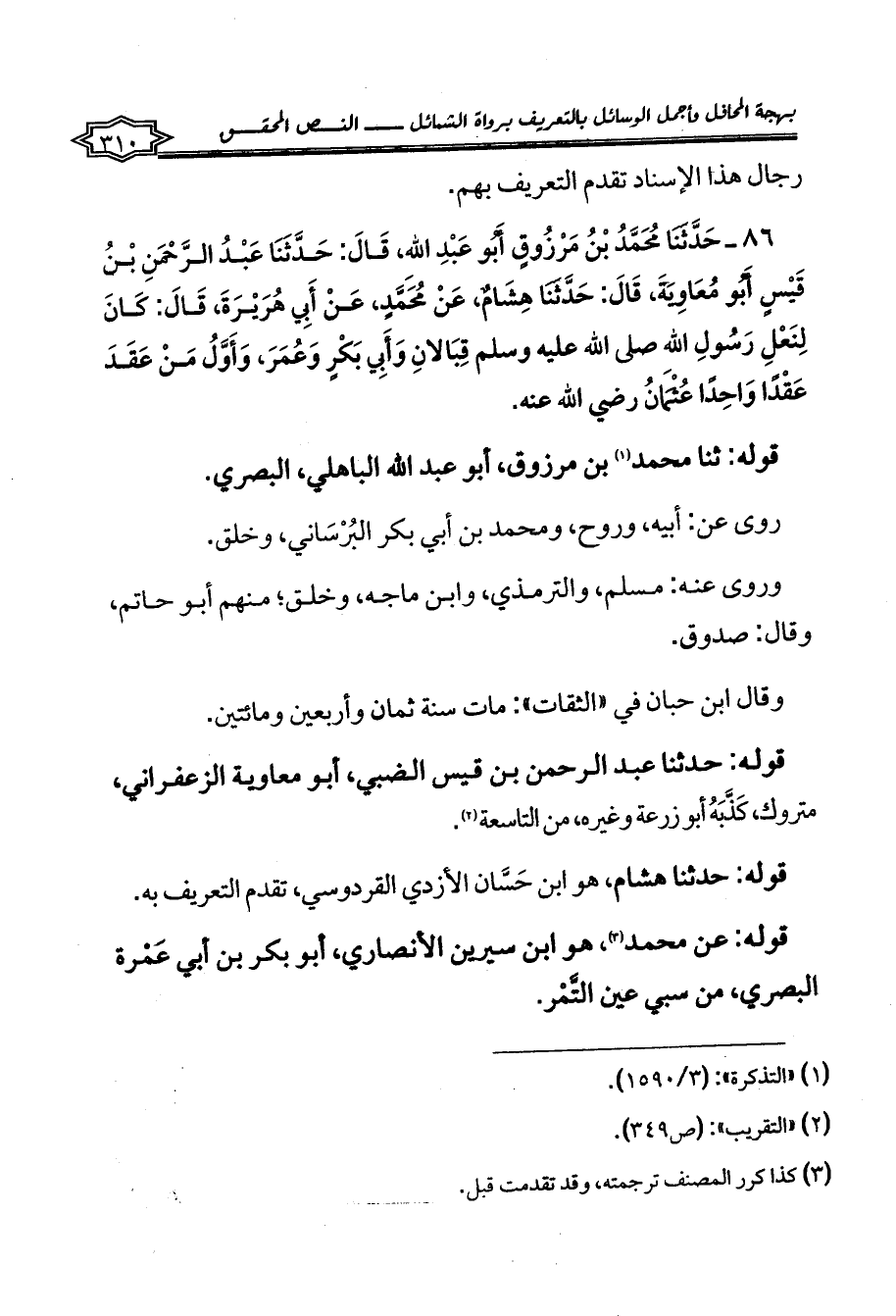 86 - حَدَّثَنَا مُحَمَّدُ بْنُ مَرْزُوقٍ أَبُو عَبْدِ اللهِ، قَالَ: حَدَّثَنَا عَبْدُ الرَّحْمَنِ بْنُ قَيْسٍ أَبُو مُعَاوِيَةَ، قَالَ: حَدَّثَنَا هِشَامٌ، عَنْ مُحَمَّدٍ، عَنْ أَبِي هُرَيْرَةَ، قَالَ: كَانَ لِنَعْلِ رَسُولِ اللهِ صلى الله عليه وسلم قِبَالانِ وَأَبِي بَكْرٍ وَعُمَرَ، وَأَوَّلُ مَنْ عَقَدَ عَقْدًا وَاحِدًا عُثْمَانُ رضي الله عنه.