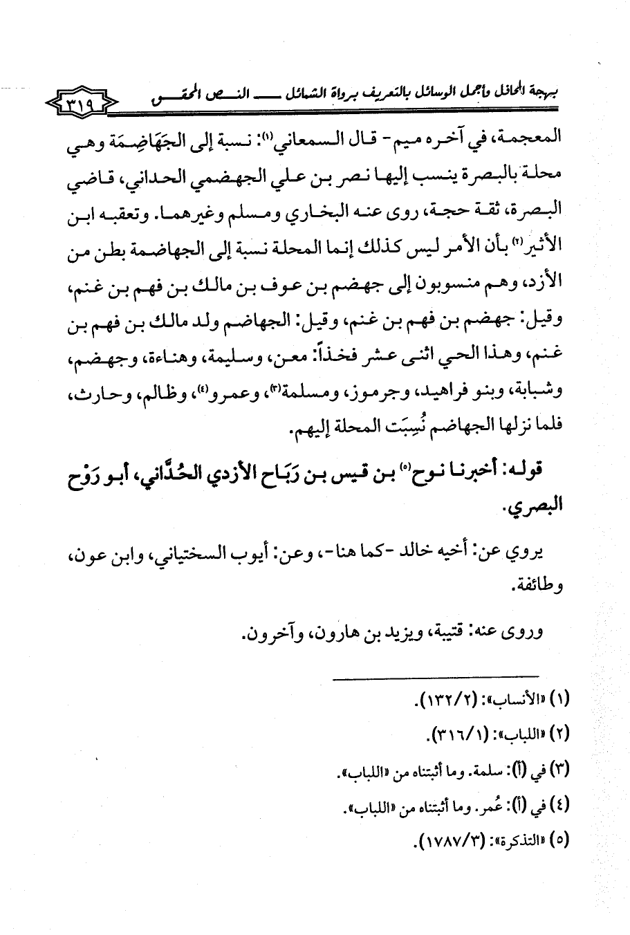 المعجمة، في آخره ميم- قال السمعاني (¬1): نسبة إلى الجَهَاضِمَة وهي محلة بالبصرة ينسب إليها نصر بن علي الجهضمي الحداني، قاضي البصرة، ثقة حجة، روى عنه البخاري ومسلم وغيرهما. وتعقبه ابن الأثير (¬2) بأن الأمر ليس كذلك إنما المحلة نسبة إلى الجهاضمة بطن من الأزد، وهم منسوبون إلى جهضم بن عوف بن مالك بن فهم بن غنم، وقيل: جهضم بن فهم بن غنم، وقيل: الجهاضم ولد مالك بن فهم بن غنم، وهذا الحي اثنى عشر فخذاً: معن، وسليمة، وهناءة، وجهضم، وشبابة، وبنو فراهيد، وجرموز، ومسلمة (¬3)، وعمرو (¬4)، وظالم، وحارث، فلما نزلها الجهاضم نُسِبَت المحلة إليهم.