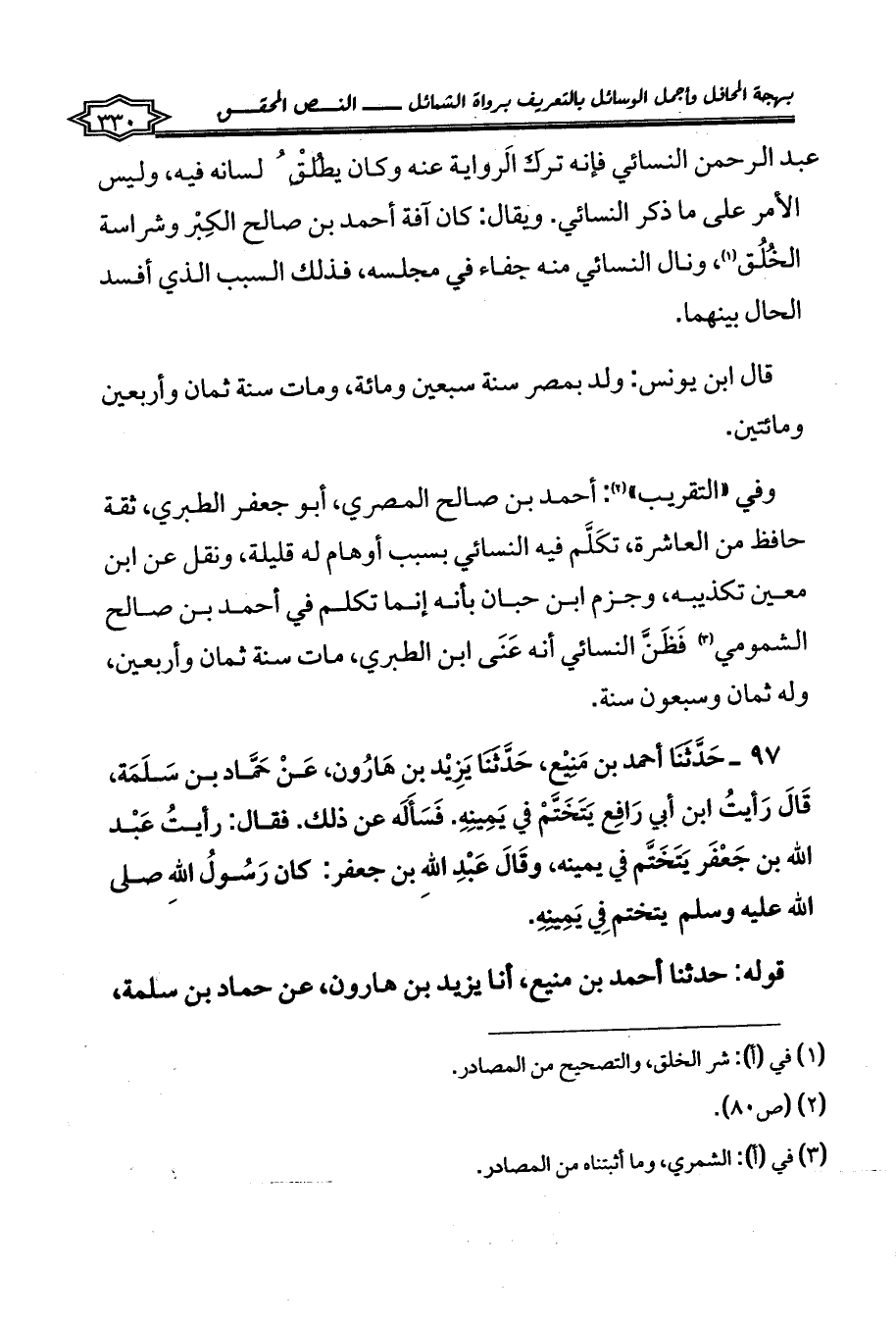 وفي «التقريب» (¬2): أحمد بن صالح المصري، أبو جعفر الطبري، ثقة حافظ من العاشرة، تكَلَّم فيه النسائي بسبب أوهام له قليلة، ونقل عن ابن معين تكذيبه، وجزم ابن حبان بأنه إنما تكلم في أحمد بن صالح الشمومي (¬3) فَظَنَّ النسائي أنه عَنَى ابن الطبري، مات سنة ثمان وأربعين، وله ثمان وسبعون سنة.