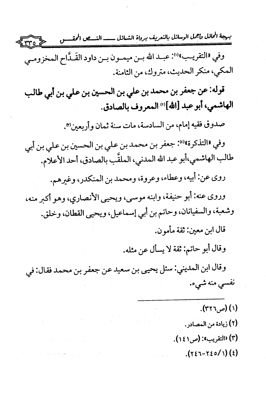 قوله: عن جعفر بن محمد بن علي بن الحسين بن علي بن أبي طالب الهاشمي، أبو عبد [الله] (¬2) المعروف بالصادق.