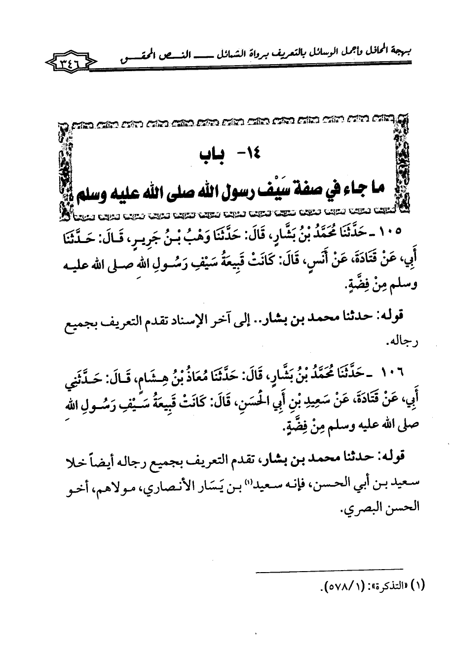 106 - حَدَّثَنَا مُحَمَّدُ بْنُ بَشَّارٍ، قَالَ: حَدَّثَنَا مُعَاذُ بْنُ هِشَامٍ، قَالَ: حَدَّثَنِي أَبِي، عَنْ قَتَادَةَ، عَنْ سَعِيدِ بْنِ أَبِي الْحَسَنِ، قَالَ: كَانَتْ قَبِيعَةُ سَيْفِ رَسُولِ اللهِ صلى الله عليه وسلم مِنْ فِضَّةٍ.