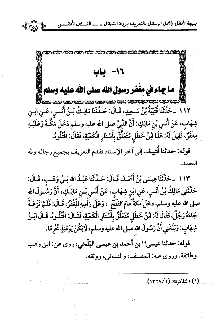 112 - حَدَّثَنَا قُتَيْبَةُ بْنُ سَعِيدٍ، قَالَ: حَدَّثَنَا مَالِكُ بْنُ أَنَسٍ، عَنِ ابْنِ شِهَابٍ، عَنْ أَنَسِ بْنِ مَالِكٍ: أَنَّ النَّبِيَّ صلى الله عليه وسلم دَخَلَ مَكَّةَ وَعَلَيْهِ مِغْفَرٌ، فَقِيلَ لَهُ: هَذَا ابْنُ خَطَلٍ مُتَعَلِّقٌ بِأَسْتَارِ الْكَعْبَةِ، فَقَالَ: اقْتُلُوهُ.