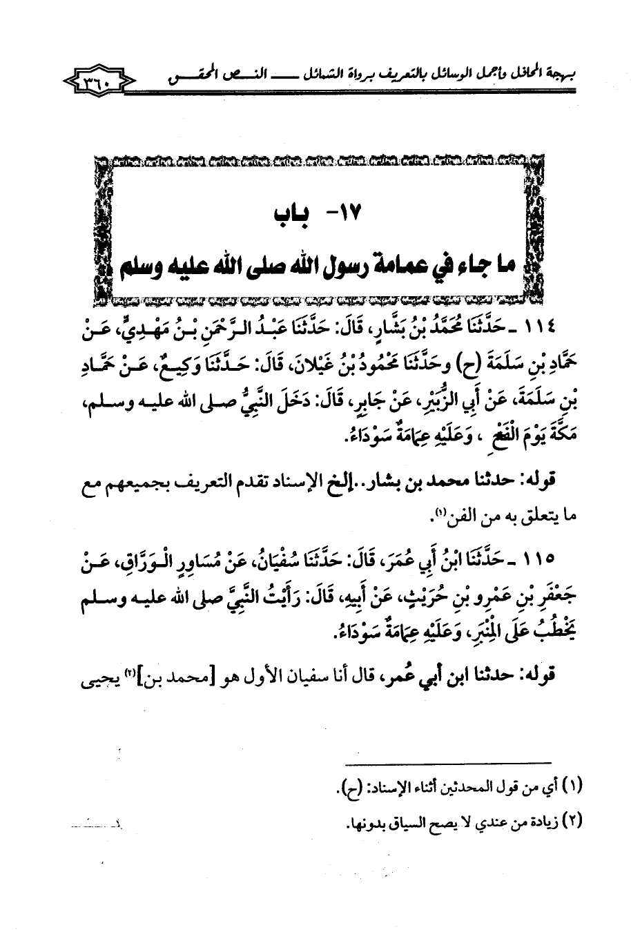 114 - حَدَّثَنَا مُحَمَّدُ بْنُ بَشَّارٍ، قَالَ: حَدَّثَنَا عَبْدُ الرَّحْمَنِ بْنُ مَهْدِيٍّ، عَنْ حَمَّادِ بْنِ سَلَمَةَ (ح) وحَدَّثَنَا مَحْمُودُ بْنُ غَيْلانَ، قَالَ: حَدَّثَنَا وَكِيعٌ، عَنْ حَمَّادِ بْنِ سَلَمَةَ، عَنْ أَبِي الزُّبَيْرِ، عَنْ جَابِرٍ، قَالَ: دَخَلَ النَّبِيُّ صلى الله عليه وسلم، مَكَّةَ يَوْمَ الْفَتْحِ، وَعَلَيْهِ عِمَامَةٌ سَوْدَاءُ.