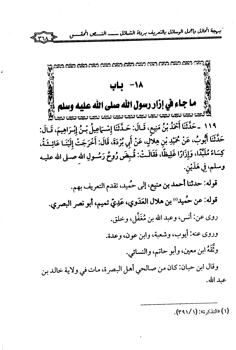119 - حَدَّثَنَا أَحْمَدُ بْنُ مَنِيعٍ، قَالَ: حَدَّثَنَا إِسْمَاعِيلُ بْنُ إِبْرَاهِيمَ، قَالَ: حَدَّثَنَا أَيُّوبُ، عَنْ حُمَيْدِ بْنِ هِلالٍ، عَنْ أَبِي بُرْدَةَ، قَالَ: أَخْرَجَتْ إِلَيْنَا عَائِشَةُ، كِسَاءً مُلَبَّدًا، وَإِزَارًا غَلِيظًا، فَقَالَتْ: قُبِضَ رُوحُ رَسُولِ اللهِ صلى الله عليه وسلم، فِي هَذَيْنِ.