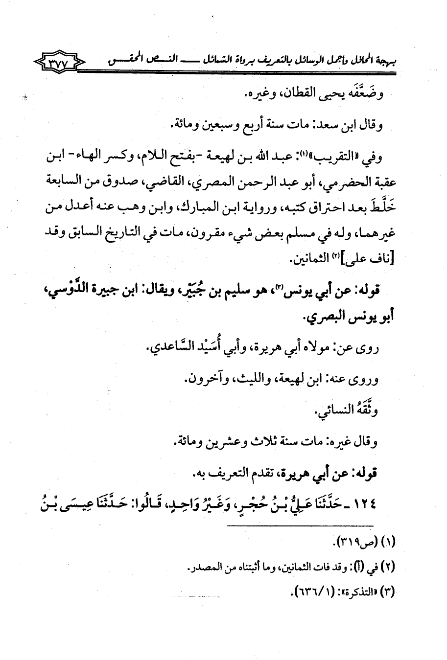 وفي «التقريب» (¬1): عبد الله بن لهيعة -بفتح اللام، وكسر الهاء- ابن عقبة الحضرمي، أبو عبد الرحمن المصري، القاضي، صدوق من السابعة خَلَّطَ بعد احتراق كتبه، ورواية ابن المبارك، وابن وهب عنه أعدل من غيرهما، وله في مسلم بعض شيء مقرون، مات في التاريخ السابق وقد [ناف على] (¬2) الثمانين.