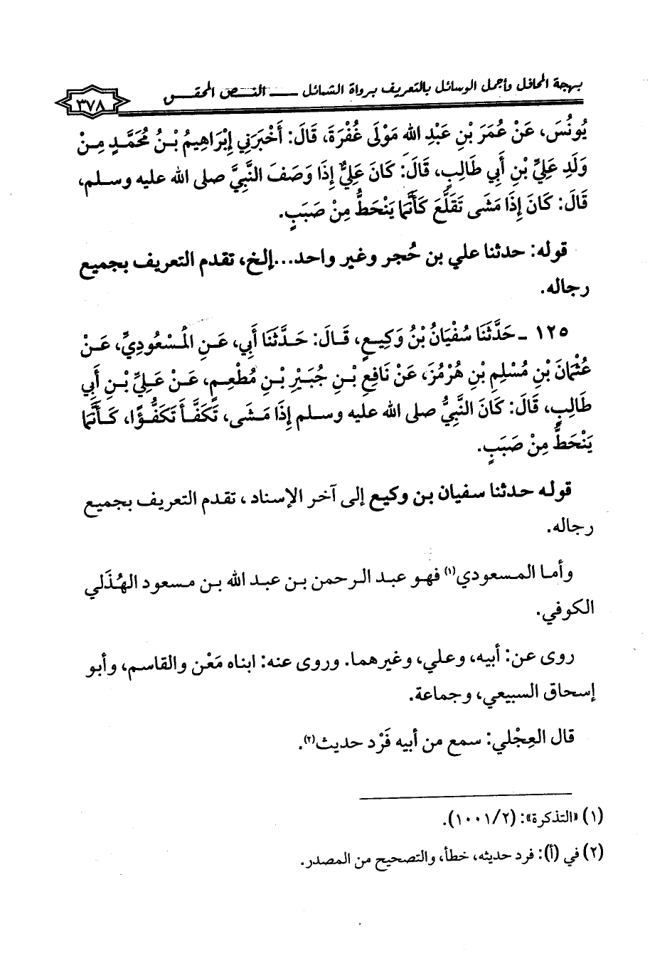 125 - حَدَّثَنَا سُفْيَانُ بْنُ وَكِيعٍ، قَالَ: حَدَّثَنَا أَبِي، عَنِ الْمَسْعُودِيِّ، عَنْ عُثْمَانَ بْنِ مُسْلِمِ بْنِ هُرْمُزَ، عَنْ نَافِعِ بْنِ جُبَيْرِ بْنِ مُطْعِمٍ، عَنْ عَلِيِّ بْنِ أَبِي طَالِبٍ، قَالَ: كَانَ النَّبِيُّ صلى الله عليه وسلم إِذَا مَشَى، تَكَفَّأَ تَكَفُّؤًا، كَأَنَّمَا يَنْحَطُّ مِنْ صَبَبٍ.