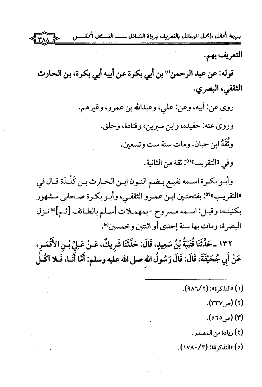 وأبو بكرة اسمه نفيع بضم النون ابن الحارث بن كَلْدَة قال في «التقريب» (¬3): بفتحتين ابن عمرو الثقفي، وأبو بكرة صحابي مشهور بكنيته، وقيل: اسمه مسروح -بمهملات أسلم بالطائف [ثم] (¬4) نزل البصرة، ومات بها سنة إحدى أو اثنتين وخمسين (¬5).