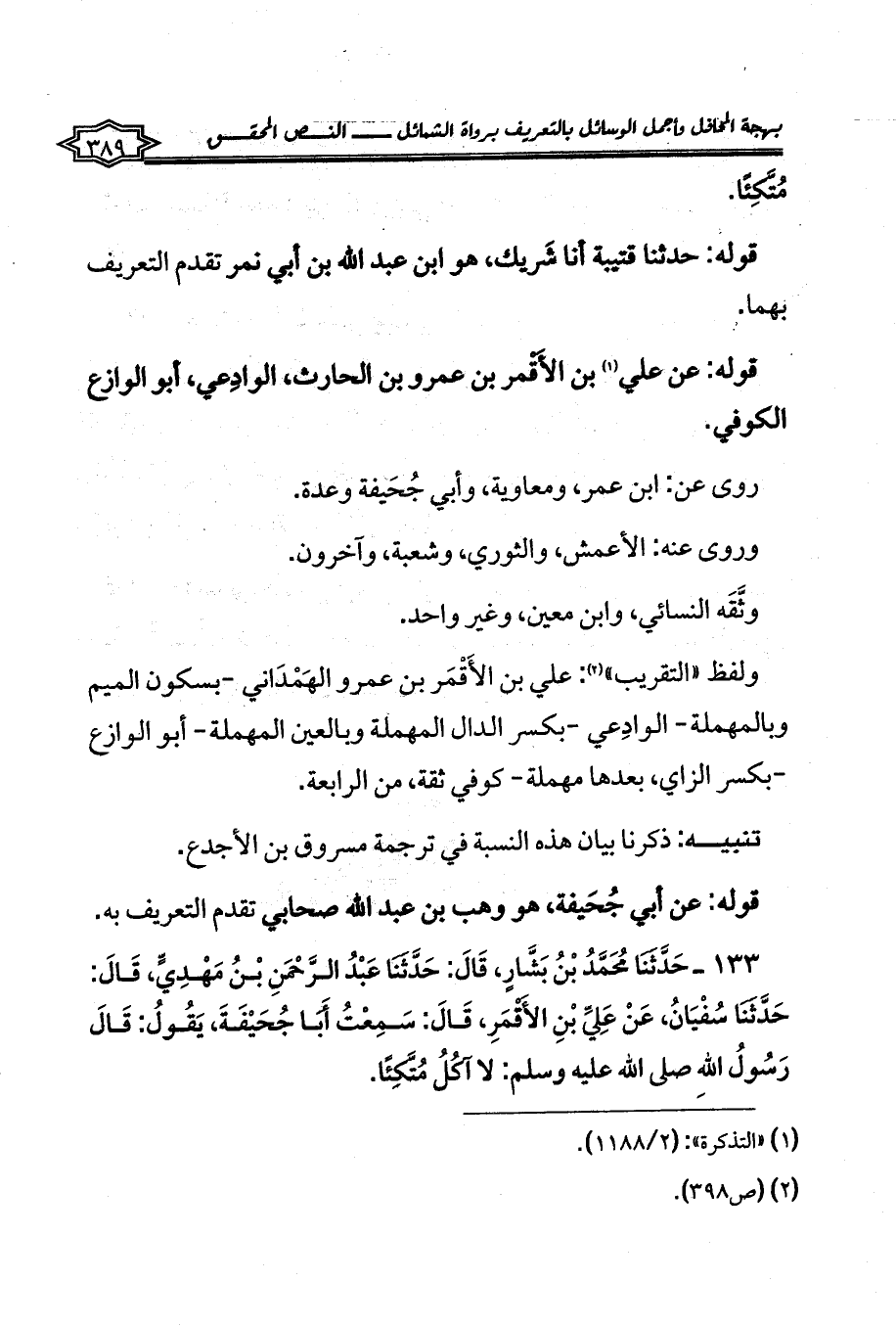 133 - حَدَّثَنَا مُحَمَّدُ بْنُ بَشَّارٍ، قَالَ: حَدَّثَنَا عَبْدُ الرَّحْمَنِ بْنُ مَهْدِيٍّ، قَالَ: حَدَّثَنَا سُفْيَانُ، عَنْ عَلِيِّ بْنِ الأَقْمَرِ، قَالَ: سَمِعْتُ أَبَا جُحَيْفَةَ، يَقُولُ: قَالَ رَسُولُ اللهِ صلى الله عليه وسلم: لا آكُلُ مُتَّكِئًا.