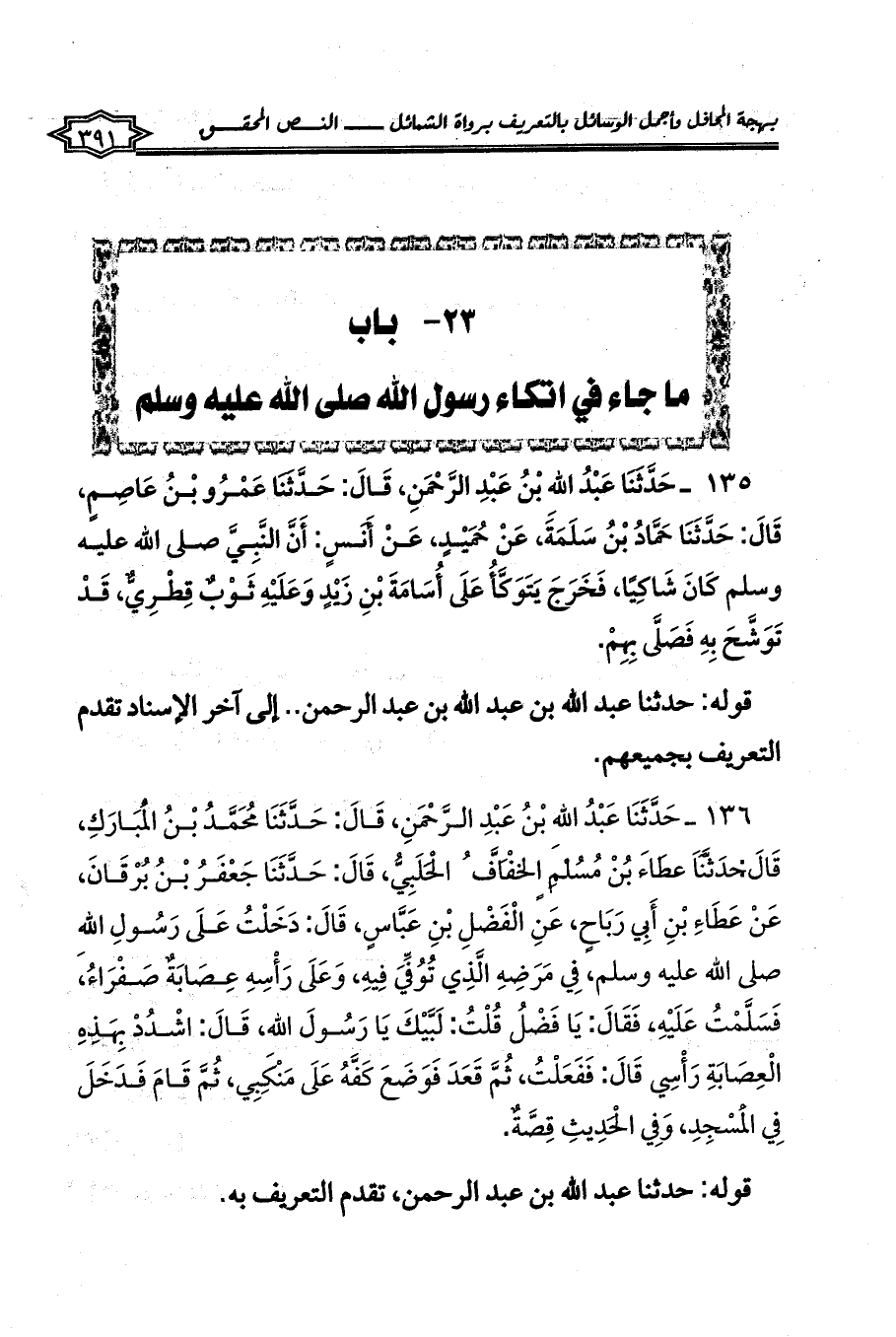 136 - حَدَّثَنَا عَبْدُ اللهِ بْنُ عَبْدِ الرَّحْمَنِ، قَالَ: حَدَّثَنَا مُحَمَّدُ بْنُ الْمُبَارَكِ، قَالَ: حَدَّثَنَا عَطَاءُ بْنُ مُسْلِمٍ الْخَفَّافُ الْحَلَبِيُّ، قَالَ: حَدَّثَنَا جَعْفَرُ بْنُ بُرْقَانَ، عَنْ عَطَاءِ بْنِ أَبِي رَبَاحٍ، عَنِ الْفَضْلِ بْنِ عَبَّاسٍ، قَالَ: دَخَلْتُ عَلَى رَسُولِ اللهِ صلى الله عليه وسلم، فِي مَرَضِهِ الَّذِي تُوُفِّيَ فِيهِ، وَعَلَى رَأْسِهِ عِصَابَةٌ صَفْرَاءُ، فَسَلَّمْتُ عَلَيْهِ، فَقَالَ: يَا فَضْلُ قُلْتُ: لَبَّيْكَ يَا رَسُولَ اللهِ، قَالَ: اشْدُدْ بِهَذِهِ الْعِصَابَةِ رَأْسِي قَالَ: فَفَعَلْتُ، ثُمَّ قَعَدَ فَوَضَعَ كَفَّهُ عَلَى مَنْكِبِي، ثُمَّ قَامَ فَدَخَلَ فِي الْمَسْجِدِ، وَفِي الْحَدِيثِ قِصَّةٌ.