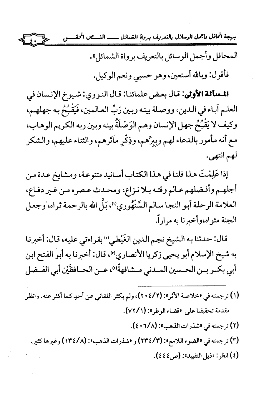 المسألة الأولى: قال بعض علمائنا: قال النووي: شيوخ الإنسان في العلم آباء في الدين، ووصلة بينه وبين رَبِّ العالمين، فَيَقْبُحُ به جهلهم، وكيف لا يَقْبُحُ جهل الإنسان وهم الوَصْلَةُ بينه وبين ربه الكريم الوهاب، مع أنه مأمور بالدعاء لهم وبِبِرِّهم، وذِكْرِ مآثرهم، والثناء عليهم، والشكر لهم انتهى.