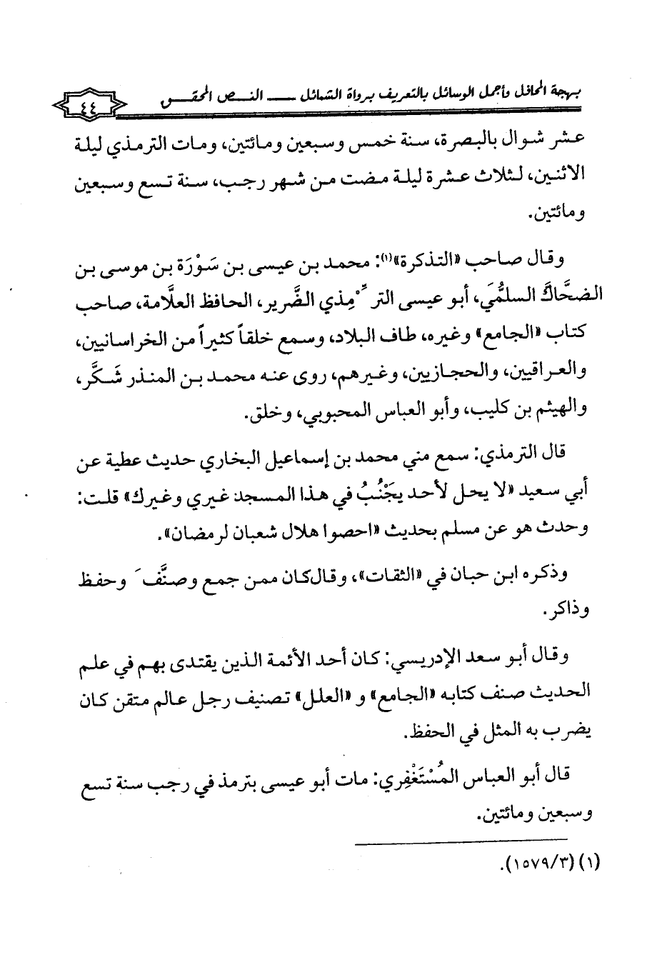 وقال صاحب «التذكرة» (¬1): محمد بن عيسى بن سَوْرَة بن موسى بن الضَّحَّاك السُّلَمي، أبو عيسى التِّرْمِذي الضَّرير، الحافظ العلَّامة، صاحب كتاب «الجامع» وغيره، طاف البلاد، وسمع خلقاً كثيراً من الخراسانيين، والعراقيين، والحجازيين، وغيرهم، روى عنه محمد بن المنذر شَكَّر، والهيثم بن كليب، وأبو العباس المحبوبي، وخلق.