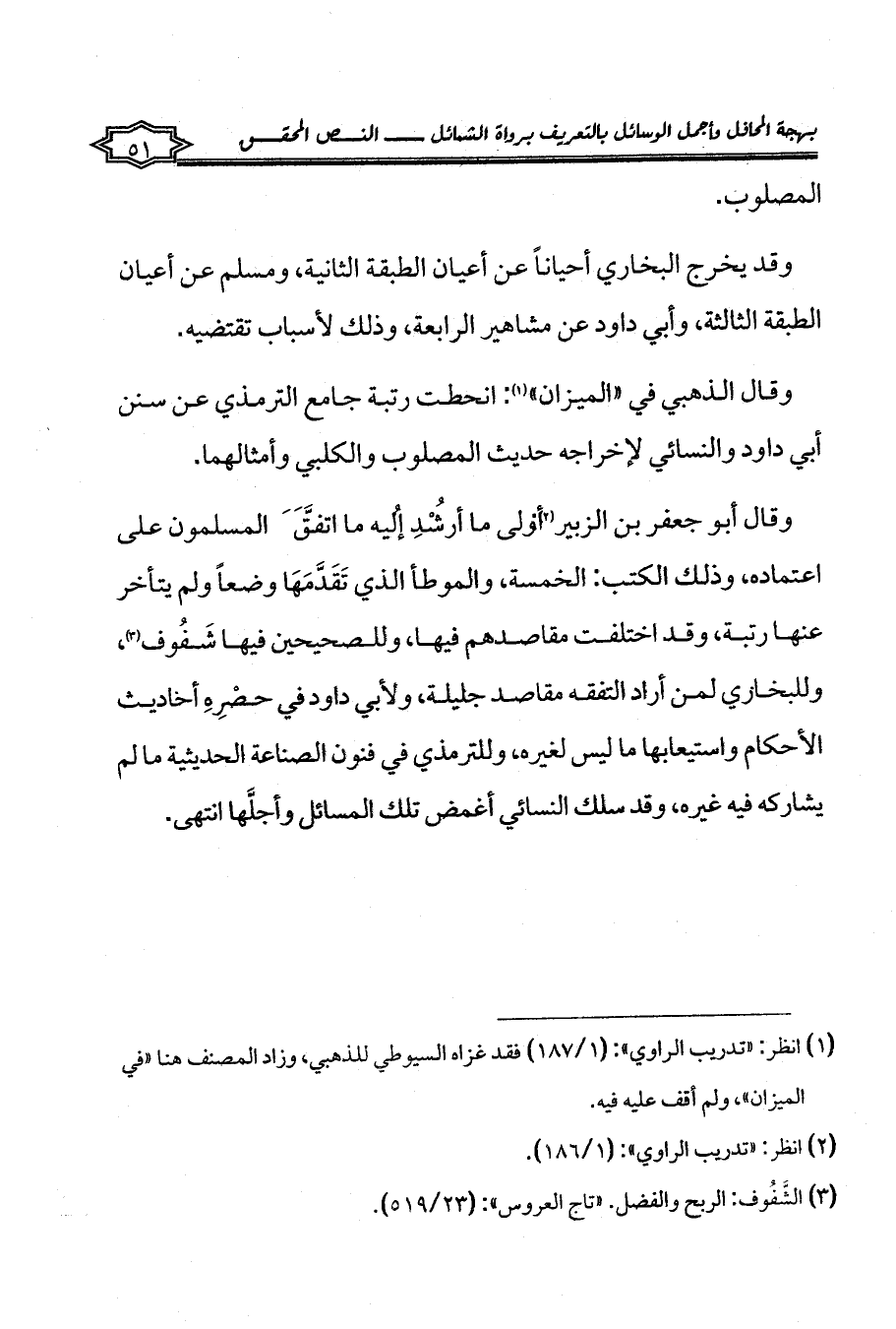 وقال أبو جعفر بن الزبير (¬2): أولى ما أُرْشِدُ إليه ما اتَّفَقَ المسلمون على اعتماده، وذلك الكتب: الخمسة، والموطأ الذي تَقَدَّمَهَا وضعاً ولم يتأخر عنها رتبة، وقد اختلفت مقاصدهم فيها، وللصحيحين فيها شَفُوف (¬3)، وللبخاري لمن أراد التفقه مقاصد جليلة، ولأبي داود في حصْرِهِ أحاديث الأحكام واستيعابها ما ليس لغيره، وللترمذي في فنون الصناعة الحديثية ما لم يشاركه فيه غيره، وقد سلك النسائي أغمض تلك المسائل وأجلَّها انتهى.