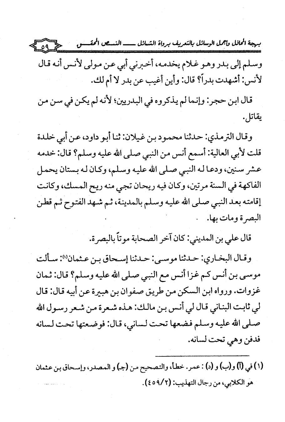وسلم إلى بدر وهو غلام يخدمه، أخبرني أبي عن مولى لأنس أنه قال لأنس: أشهدت بدراً؟ قال: وأين أغيب عن بدر لا أم لك.