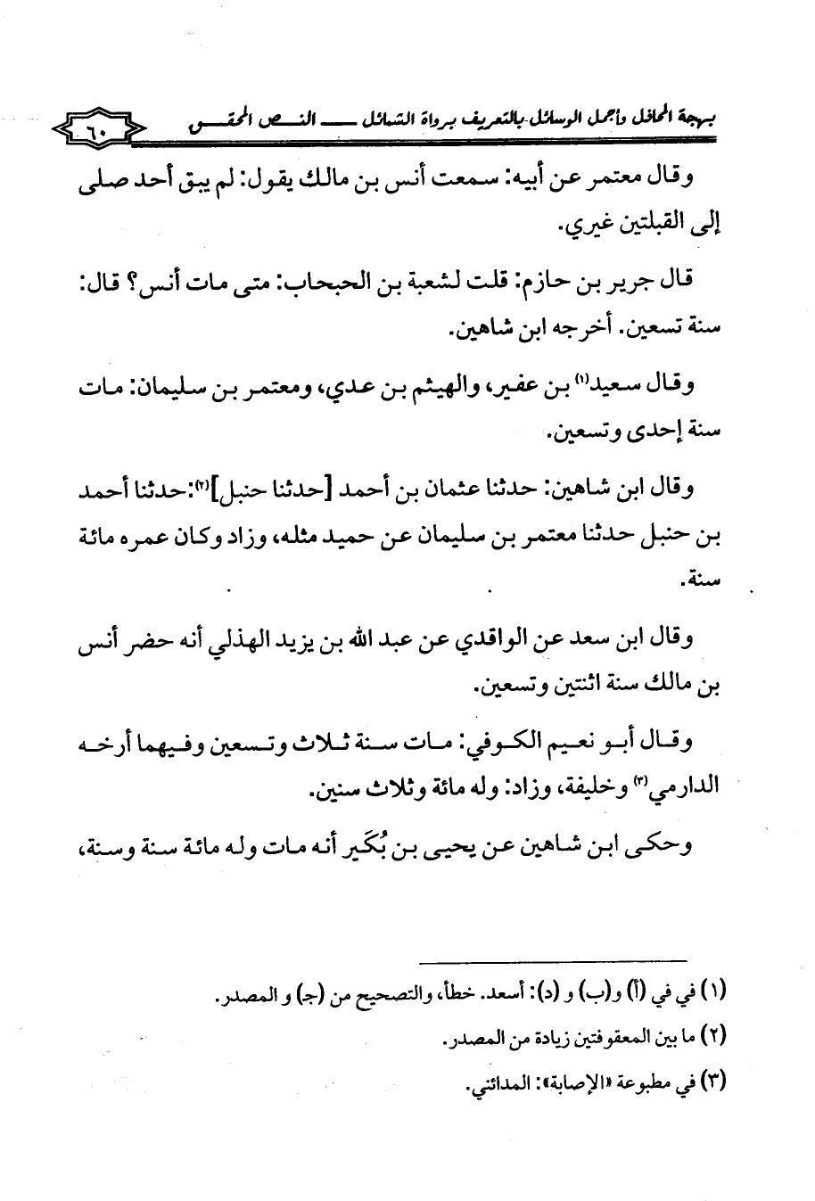 وقال ابن شاهين: حدثنا عثمان بن أحمد [حدثنا حنبل] (¬2):حدثنا أحمد بن حنبل حدثنا معتمر بن سليمان عن حميد مثله، وزاد وكان عمره مائة سنة.