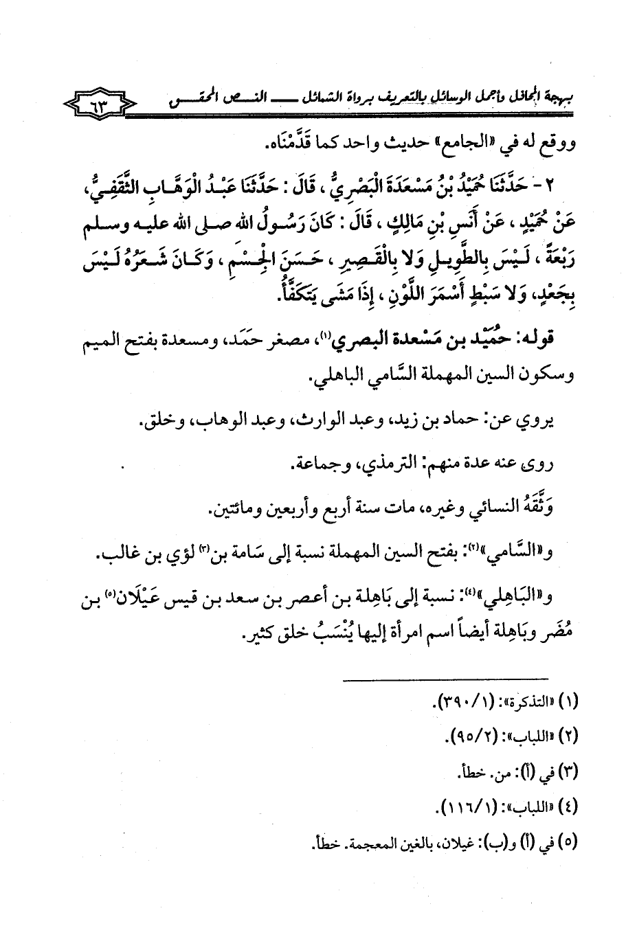 2 - حَدَّثَنَا حُمَيْدُ بْنُ مَسْعَدَةَ الْبَصْرِيُّ، قَالَ: حَدَّثَنَا عَبْدُ الْوَهَّابِ الثَّقَفِيُّ، عَنْ حُمَيْدٍ، عَنْ أَنَسِ بْنِ مَالِكٍ، قَالَ: كَانَ رَسُولُ اللهِ صلى الله عليه وسلم رَبْعَةً، لَيْسَ بِالطَّوِيلِ وَلا بِالْقَصِيرِ، حَسَنَ الْجِسْمِ، وَكَانَ شَعَرُهُ لَيْسَ بِجَعْدٍ، وَلا سَبْطٍ أَسْمَرَ اللَّوْنِ، إِذَا مَشَى يَتَكَفَّأُ.