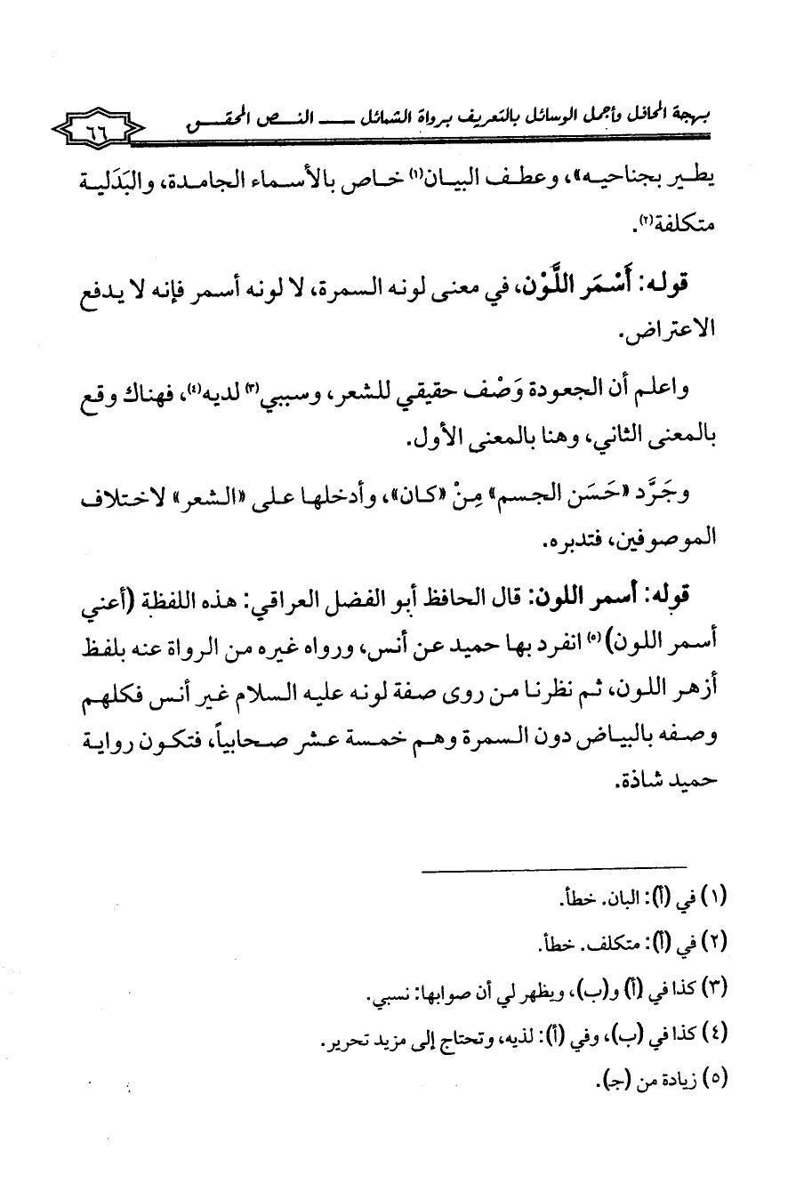 قوله: أسمر اللون: قال الحافظ أبو الفضل العراقي: هذه اللفظة (أعني أسمر اللون) (¬5) انفرد بها حميد عن أنس، ورواه غيره من الرواة عنه بلفظ أزهر اللون، ثم نظرنا من روى صفة لونه عليه السلام غير أنس فكلهم وصفه بالبياض دون السمرة وهم خمسة عشر صحابياً، فتكون رواية حميد شاذة.