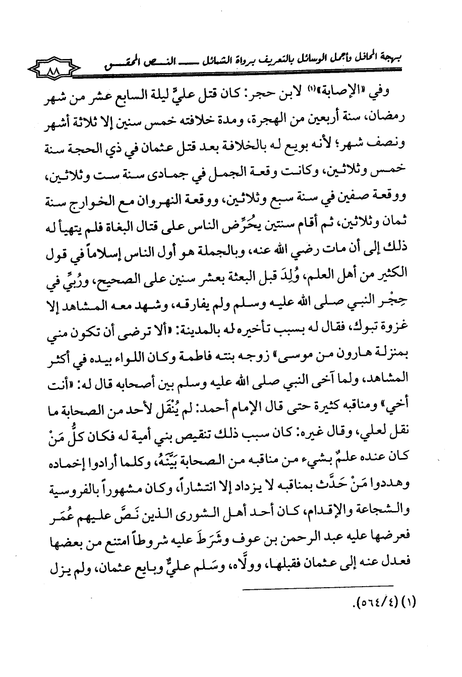 وفي «الإصابة» (¬1) لابن حجر: كان قتل عليٍّ ليلة السابع عشر من شهر رمضان، سنة أربعين من الهجرة، ومدة خلافته خمس سنين إلا ثلاثة أشهر ونصف شهر؛ لأنه بويع له بالخلافة بعد قتل عثمان في ذي الحجة سنة خمس وثلاثين، وكانت وقعة الجمل في جمادى سنة ست وثلاثين، ووقعة صفين في سنة سبع وثلاثين، ووقعة النهروان مع الخوارج سنة ثمان وثلاثين، ثم أقام سنتين يُحَرِّض الناس على قتال البغاة فلم يتهيأ له ذلك إلى أن مات رضي الله عنه، وبالجملة هو أول الناس إسلاماً في قول الكثير من أهل العلم، وُلِدَ قبل البعثة بعشر سنين على الصحيح، ورُبِّي في حِجْر النبي صلى الله عليه وسلم ولم يفارقه، وشهد معه المشاهد إلا غزوة تبوك، فقال له بسبب تأخيره له بالمدينة: «ألا ترضى أن تكون مني بمنزلة هارون من موسى» زوجه بنته فاطمة وكان اللواء بيده في أكثر المشاهد، ولما آخى النبي صلى الله عليه وسلم بين أصحابه قال له: «أنت أخي» ومناقبه كثيرة حتى قال الإمام أحمد: لم يُنْقَل لأحد من الصحابة ما نقل لعلي، وقال غيره: كان سبب ذلك تنقيص بني أمية له فكان كلُّ مَنْ كان عنده علمٌ بشيء من مناقبه من الصحابة بَيَّنَهُ، وكلما أرادوا إخماده وهددوا مَنْ حَدَّث بمناقبه لا يزداد إلا انتشاراً، وكان مشهوراً بالفروسية والشجاعة والإقدام، كان أحد أهل الشورى الذين نَصَّ عليهم عُمَر فعرضها عليه عبد الرحمن بن عوف وشَرَطَ عليه شروطاً امتنع من بعضها فعدل عنه إلى عثمان فقبلها، وولَّاه، وسَلم عليٌّ وبايع عثمان، ولم يزل