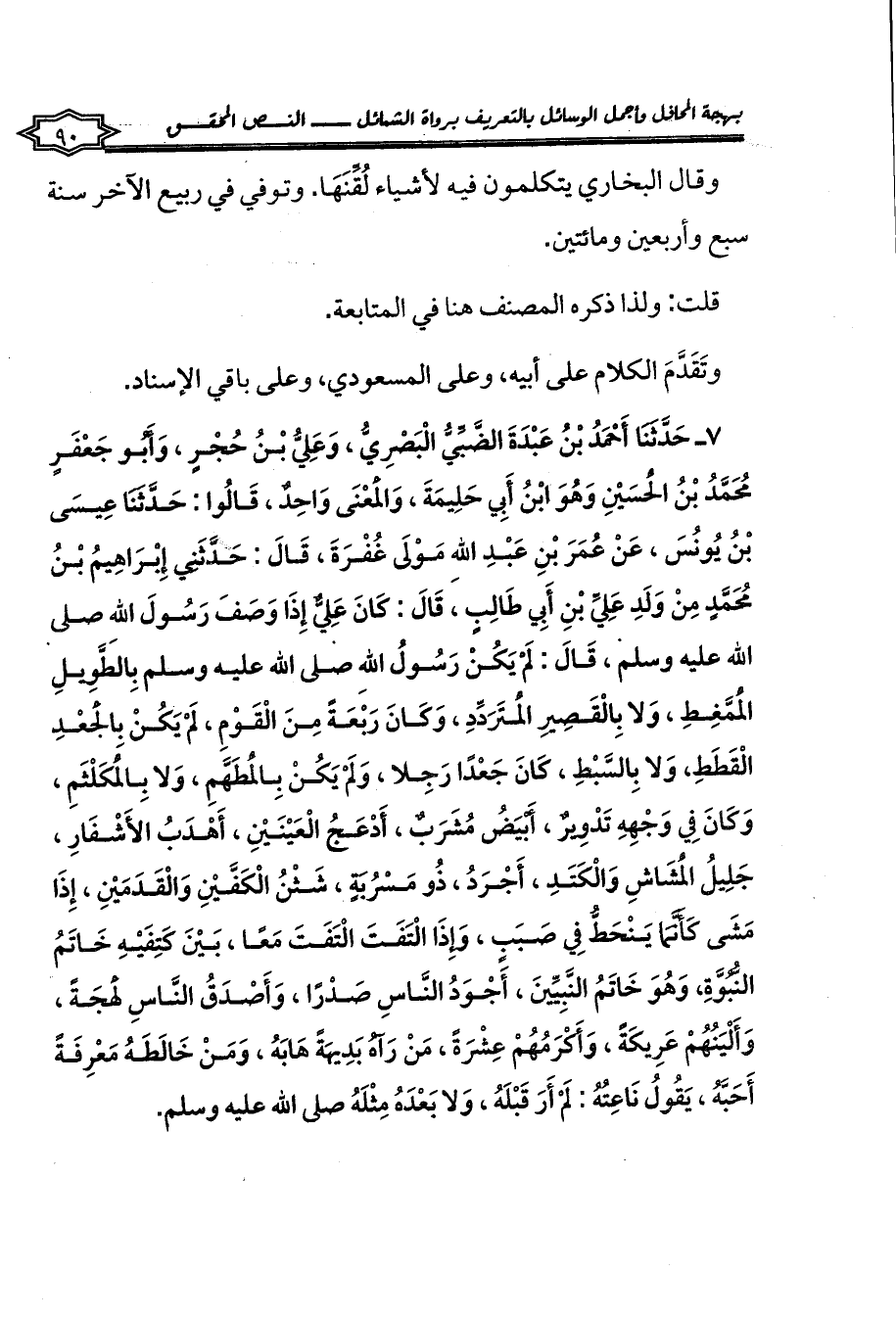 7 - حَدَّثَنَا أَحْمَدُ بْنُ عَبْدَةَ الضَّبِّيُّ الْبَصْرِيُّ، وَعَلِيُّ بْنُ حُجْرٍ، وَأَبُو جَعْفَرٍ مُحَمَّدُ بْنُ الْحُسَيْنِ وَهُوَ ابْنُ أَبِي حَلِيمَةَ، وَالْمَعْنَى وَاحِدٌ، قَالُوا: حَدَّثَنَا عِيسَى بْنُ يُونُسَ، عَنْ عُمَرَ بْنِ عَبْدِ اللهِ مَوْلَى غُفْرَةَ، قَالَ: حَدَّثَنِي إِبْرَاهِيمُ بْنُ مُحَمَّدٍ مِنْ وَلَدِ عَلِيِّ بْنِ أَبِي طَالِبٍ، قَالَ: كَانَ عَلِيٌّ إِذَا وَصَفَ رَسُولَ اللهِ صلى الله عليه وسلم، قَالَ: لَمْ يَكُنْ رَسُولُ اللهِ صلى الله عليه وسلم بِالطَّوِيلِ الْمُمَّغِطِ، وَلا بِالْقَصِيرِ الْمُتَرَدِّدِ، وَكَانَ رَبْعَةً مِنَ الْقَوْمِ، لَمْ يَكُنْ بِالْجَعْدِ الْقَطَطِ، وَلا بِالسَّبْطِ، كَانَ جَعْدًا رَجِلا، وَلَمْ يَكُنْ بِالْمُطَهَّمِ، وَلا بِالْمُكَلْثَمِ، وَكَانَ فِي وَجْهِهِ تَدْوِيرٌ، أَبْيَضُ مُشَرَبٌ، أَدْعَجُ الْعَيْنَيْنِ، أَهْدَبُ الأَشْفَارِ، جَلِيلُ الْمُشَاشِ وَالْكَتَدِ، أَجْرَدُ، ذُو مَسْرُبَةٍ، شَثْنُ الْكَفَّيْنِ وَالْقَدَمَيْنِ، إِذَا مَشَى كَأَنَّمَا يَنْحَطُّ فِي صَبَبٍ، وَإِذَا الْتَفَتَ الْتَفَتَ مَعًا، بَيْنَ كَتِفَيْهِ خَاتَمُ النُّبُوَّةِ، وَهُوَ خَاتَمُ النَّبِيِّينَ، أَجْوَدُ النَّاسِ صَدْرًا، وَأَصْدَقُ النَّاسِ لَهْجَةً، وَأَلْيَنُهُمْ عَرِيكَةً، وَأَكْرَمُهُمْ عِشْرَةً، مَنْ رَآهُ بَدِيهَةً هَابَهُ، وَمَنْ خَالَطَهُ مَعْرِفَةً أَحَبَّهُ، يَقُولُ نَاعِتُهُ: لَمْ أَرَ قَبْلَهُ، وَلا بَعْدَهُ مِثْلَهُ صلى الله عليه وسلم.
