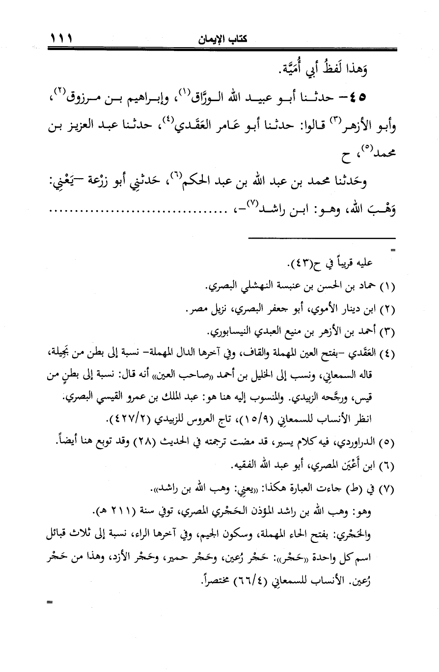 45 - حدثنا أبو عبيد الله الورَّاق (¬1)، وإبراهيم بن مرزوق (¬2)، وأبو الأزهر (¬3) قالوا: حدثنا أبو عَامر العَقَدي (¬4)، حدثنا عبد العزيز بن محمد (¬5)، ح