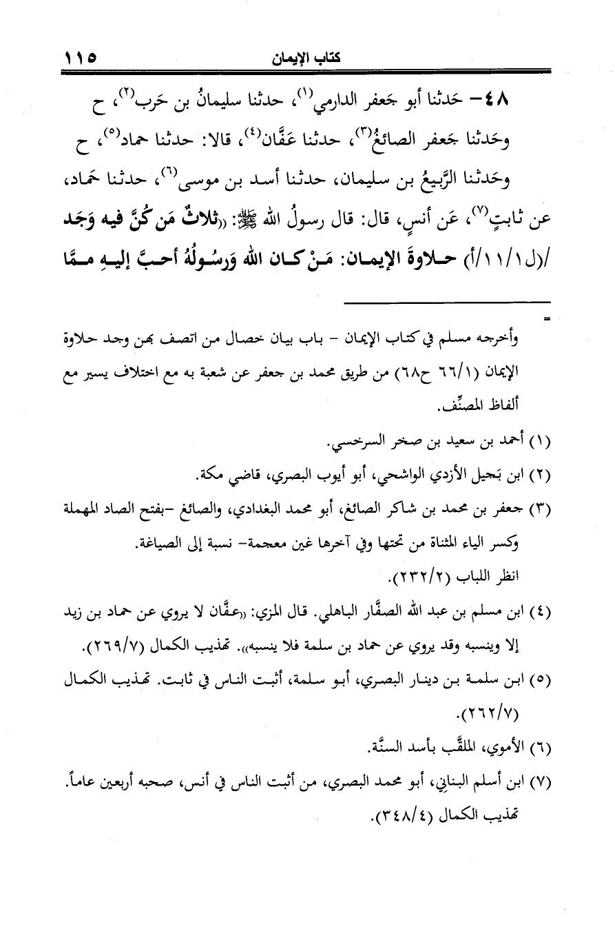 (¬9) أخرجه مسلم في كتاب الإيمان -باب بيان خصال من اتصف بهن وجد حلاوة الإيمان (1/ 67 ح 68) من طريق النضر بن شميل عن حماد، ولفظه كلفظ عفان وسليمان بن حرب.