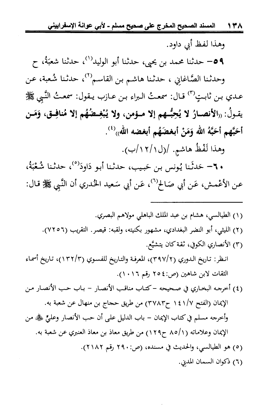 وحدثنا الصَّاغانِي، حدثنا هاشم بن القاسم (¬2)، حدثنا شُعبة، عن عدي بن ثابتٍ (¬3) قال: سمعتُ البراء بن عازب يقول: سمعتُ النَّبيَّ -صلى الله عليه وسلم- يقولُ: "الأنصارُ لا يُحِبُّهم إلا مؤمن، ولا يُبْغِضُهُم إلا مُنافِق، وَمَن أحَبَّهم أحَبَّهُ الله وَمَنْ أبغضَهُم أبغضه الله" (¬4).