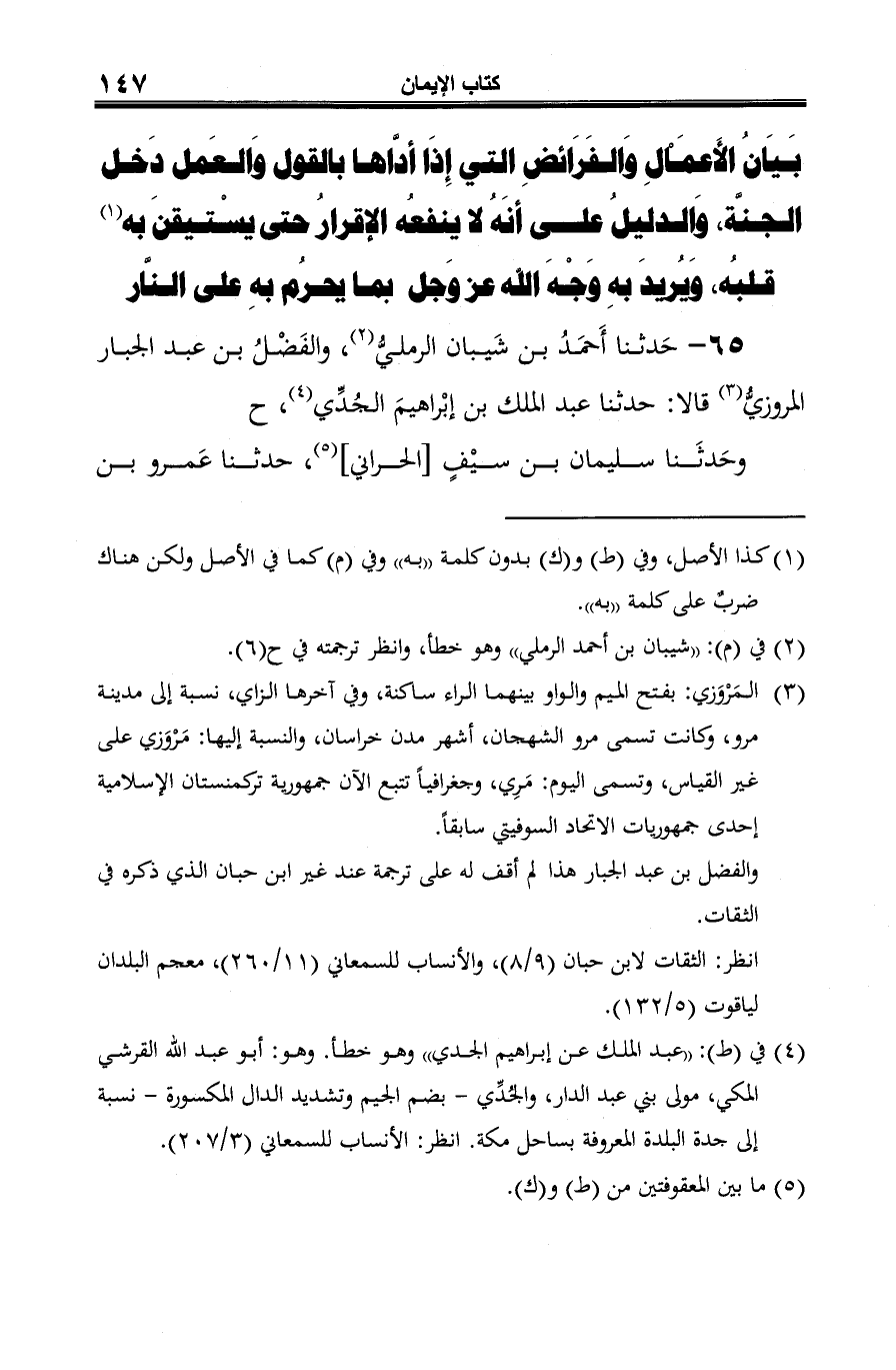بَيَانُ الأَعمَالِ وَالفَرَائضِ التي إِذَا أدَّاها بالقول وَالعَمل دَخل الجنَّة، وَالدليلُ على أَنَّهُ لا ينفعُه الإقرارُ حتى يسْتيقنَ به (¬1) قلبُه، وَيُريدَ بهِ وَجْهَ الله عز وَجل بما يحرُم بهِ على النَّار