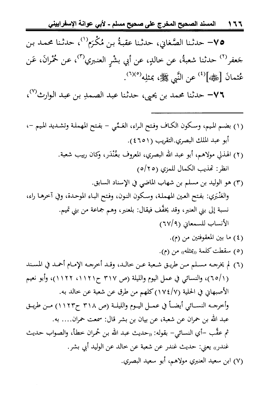 75 - حدثنا الصَّغاني، حدثنا عقبةُ بن مُكْرَم (¬1)، حدثنا محمد بن جَعفر (¬2) حدثنا شعبةُ، عن خالدٍ، عن أبي بشْرٍ العنبري (¬3)، عن حُمْرانَ، عَن عُثمانَ [رضي الله عنه] (¬4) عن النَّبي -صلى الله عليه وسلم-، بمثلِه (¬5) (¬6).