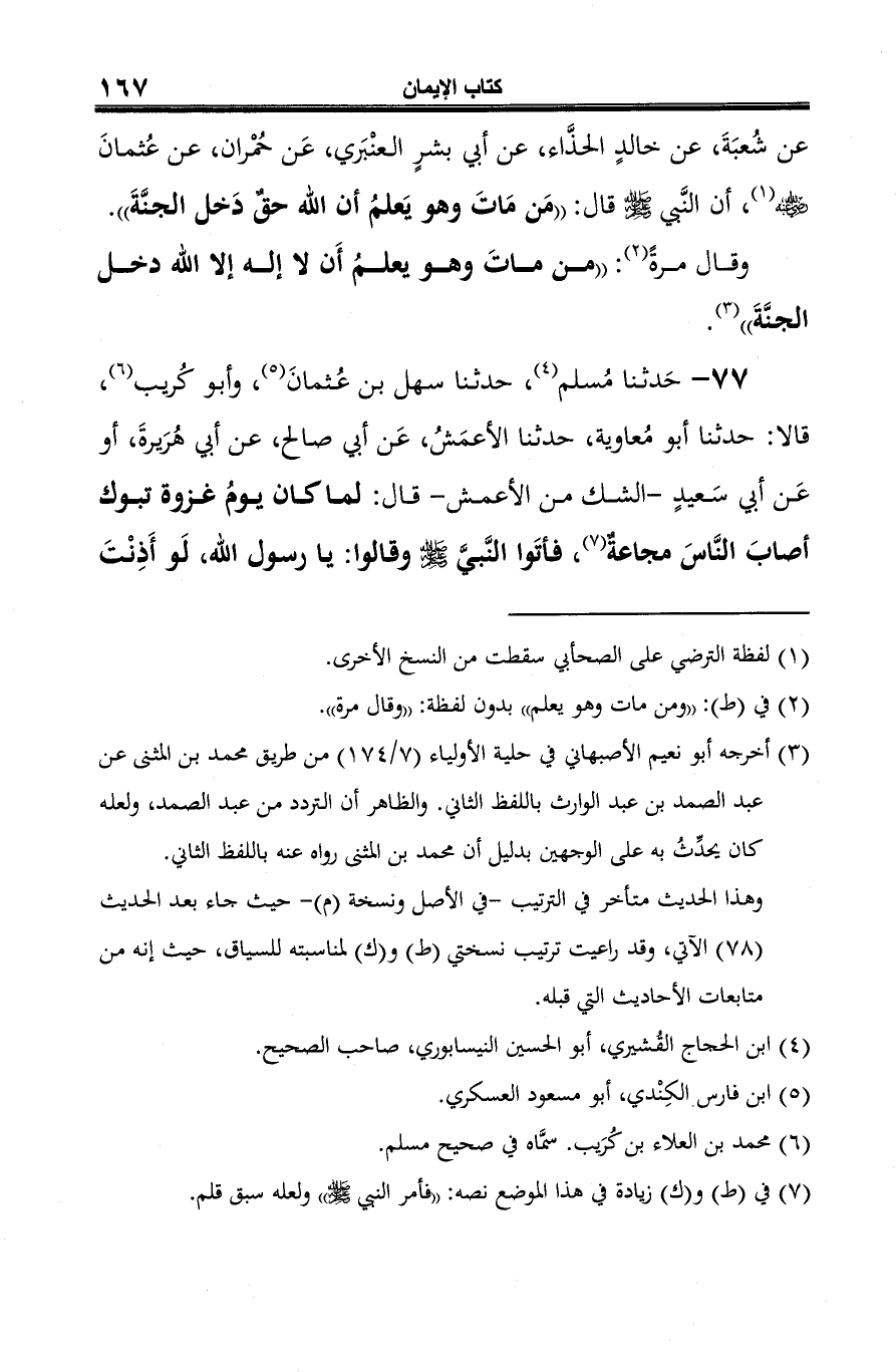 77 - حَدثنا مُسلم (¬1)، حدثنا سهل بن عُثمانَ (¬2)، وأبو كُريب (¬3)، قالا: حدثنا أبو مُعاوية، حدثنا الأعمَشُ، عَن أبي صالح، عن أبي هُرَيرةَ، أو عَن أبي سَعيدٍ -الشك من الأعمش- قال: لما كان يومُ غزوة تبوك أصابَ النَّاسَ مجاعةٌ (¬4)، فأتَوا النَّبيَّ -صلى الله عليه وسلم- وقالوا: يا رسول الله، لَو أَذِنْتَ