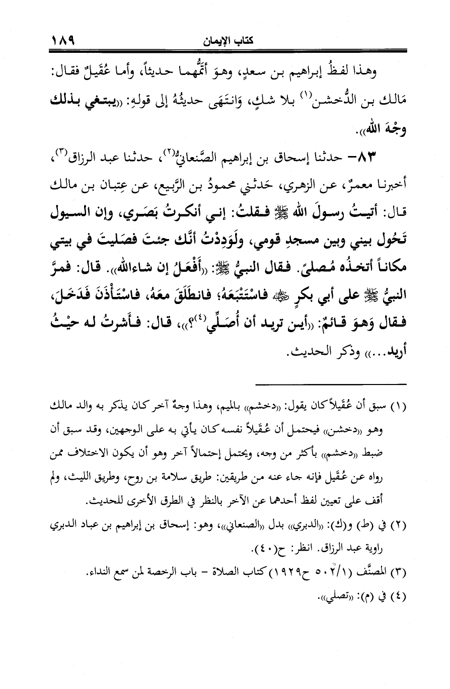83 - حدثنا إسحاق بن إبراهيم الصَّنعانيُّ (¬1)، حدثنا عبد الرزاق (¬2)، أخبرنا معمرٌ، عن الزهري، حَدثني محمودُ بن الرَّبيع، عن عِتبان بن مالك قال: أتيتُ رسولَ الله -صلى الله عليه وسلم- فقلتُ: إني أنكرتُ بَصَري، وإن السيول تَحُول بيني وبين مسجدِ قومي، ولَوَدِدْتُ أنَّك جئتَ فصَليتَ في بيتي مكانًا أتخذُه مُصلىً. فقال النبيُّ -صلى الله عليه وسلم-: "أَفْعَلُ إن شاء الله". قال: فمرَّ النبيُّ -صلى الله عليه وسلم- على أبي بكرٍ -رضي الله عنه- فاسْتَتْبَعَهُ؛ فانطَلَقَ معَهُ، فاسْتَأْذَنَ فَدَخَلَ، فقال وَهوَ قائمٌ: "أين تريد أن أُصَلِّي (¬3)؟ "، قال: فأَشرتُ له حيْثُ أريد ... " وذكر الحديث.