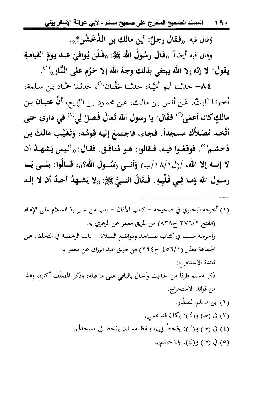 (¬5) أخرجه مسلم في كتاب الإيمان -باب الدليل على أن من مات على التوحيد دخل الجنة قطعًا (1/ 62 ح 55) من طريق حماد بن سلمة، عن ثابت، عن أنس قال: حدثني عِتبان به.