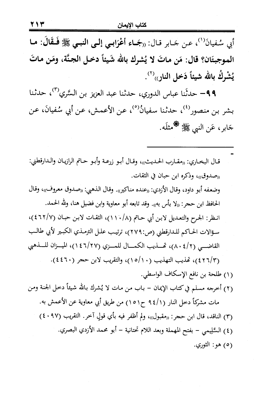 99 - حدثَنا عباس الدوري، حدثنا عبد العزيز بن السَّري (¬1)، حدثنا بشر بن منصور (¬2)، حدثنا سفيانُ (¬3)، عن الأعمش، عن أبي سُفيانَ، عن جَابر، عَن النبي -صلى الله عليه وسلم- * مثلَه.