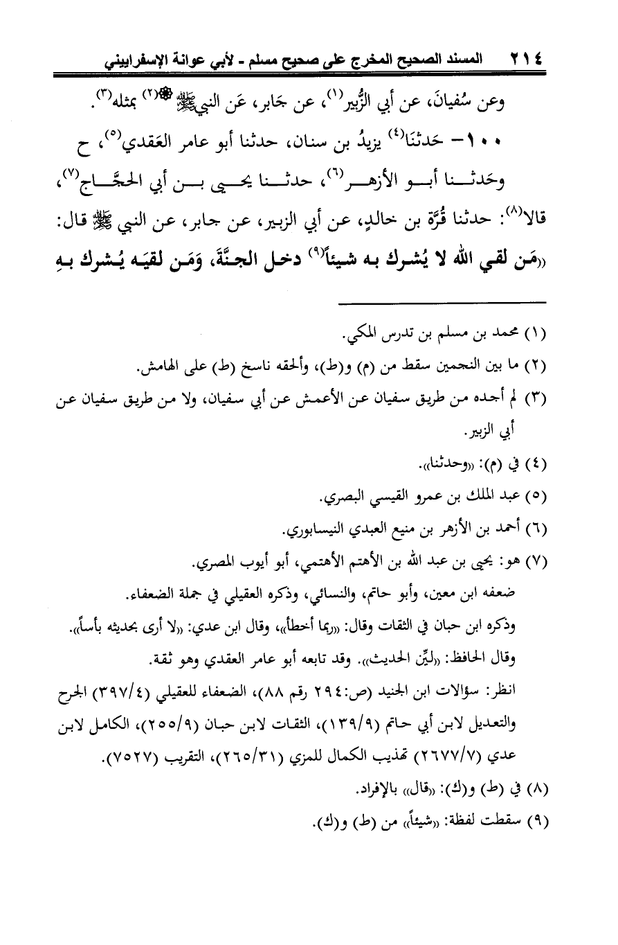 وحَدثنا أبو الأزهر (¬3)، حدثنا يحيى بن أبي الحجَّاج (¬4)، قالا (¬5): حدثنا قُرَّة بن خالدٍ، عن أبي الزبير، عن جابر، عن النبي -صلى الله عليه وسلم- قال: "مَن لقي الله لا يُشرك به شيئًا (¬6) دخل الجنَّةَ، وَمَن لقيَه يُشرك بهِ