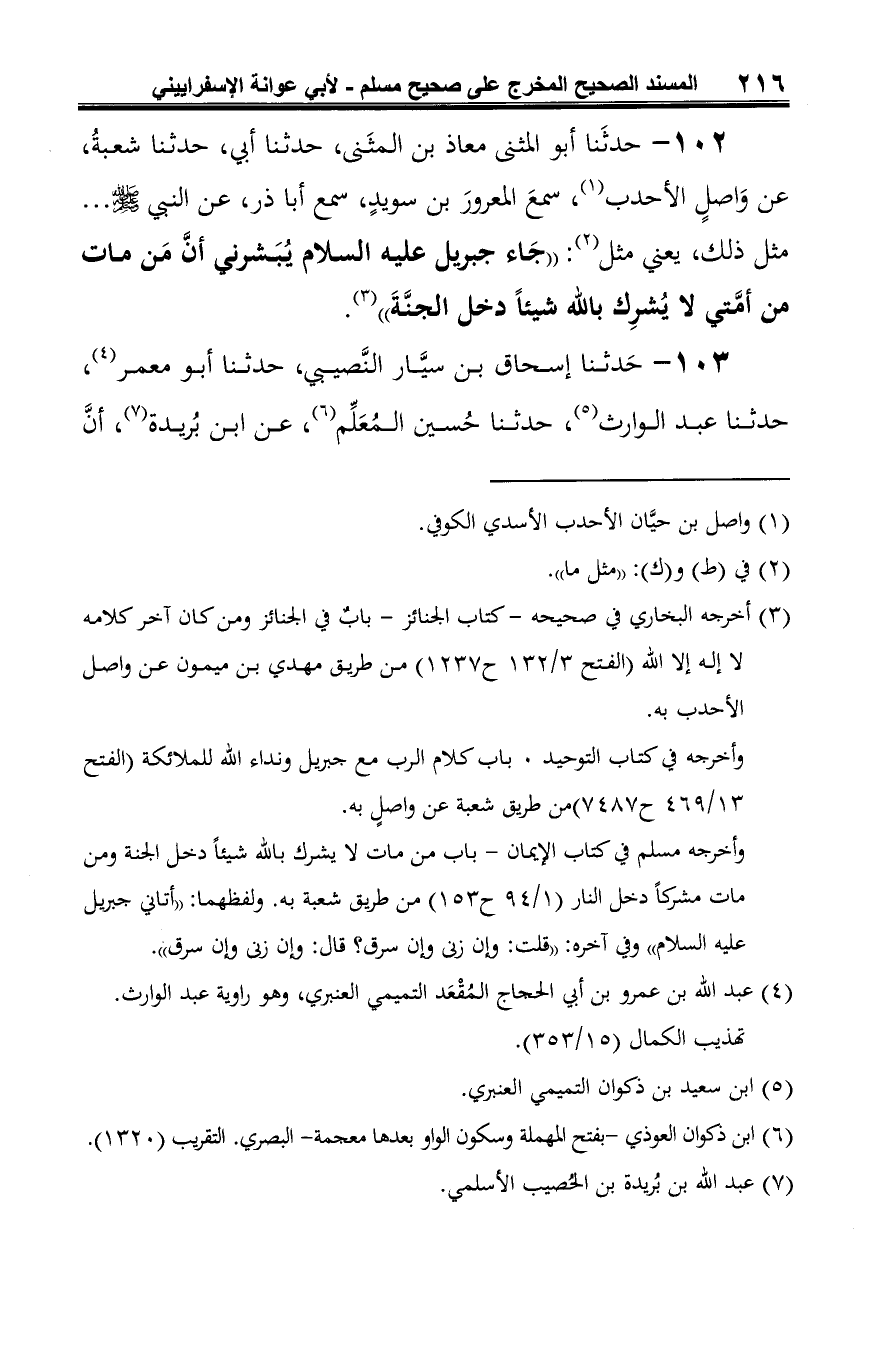 102 - حدثَنا أبو المثنى معاذ بن المثَنى، حدثنا أبي، حدثنا شعبةُ، عن وَاصلٍ الأحدب (¬1)، سمعَ المعرورَ بن سويدٍ، سمع أبا ذر، عن النبي -صلى الله عليه وسلم- ... مثل ذلك، يعني مثل (¬2): "جَاء جبريل عليه السلام يُبَشرني أنَّ مَن مات من أمَّتي لا يُشرِك بالله شيئًا دخل الجنَّةَ" (¬3).