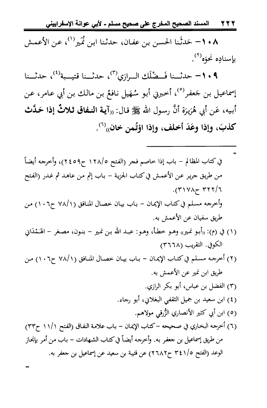 109 - حدثنا فَضْلَك الرازي (¬1)، حدثنا قتيبة (¬2)، حدثنا إسماعيل بن جَعفر (¬3)، أخبرني أبو سُهَيل نافعُ بن مالك بن أبي عامر، عن أبيه، عَن أبي هُرَيرَة أنَّ رسول الله -صلى الله عليه وسلم- قال: "آية النفاق ثلاث إذا حَدَّث كذبَ، وإذا وعَدَ أخلف، وإذا اؤتُمن خان" (¬4).