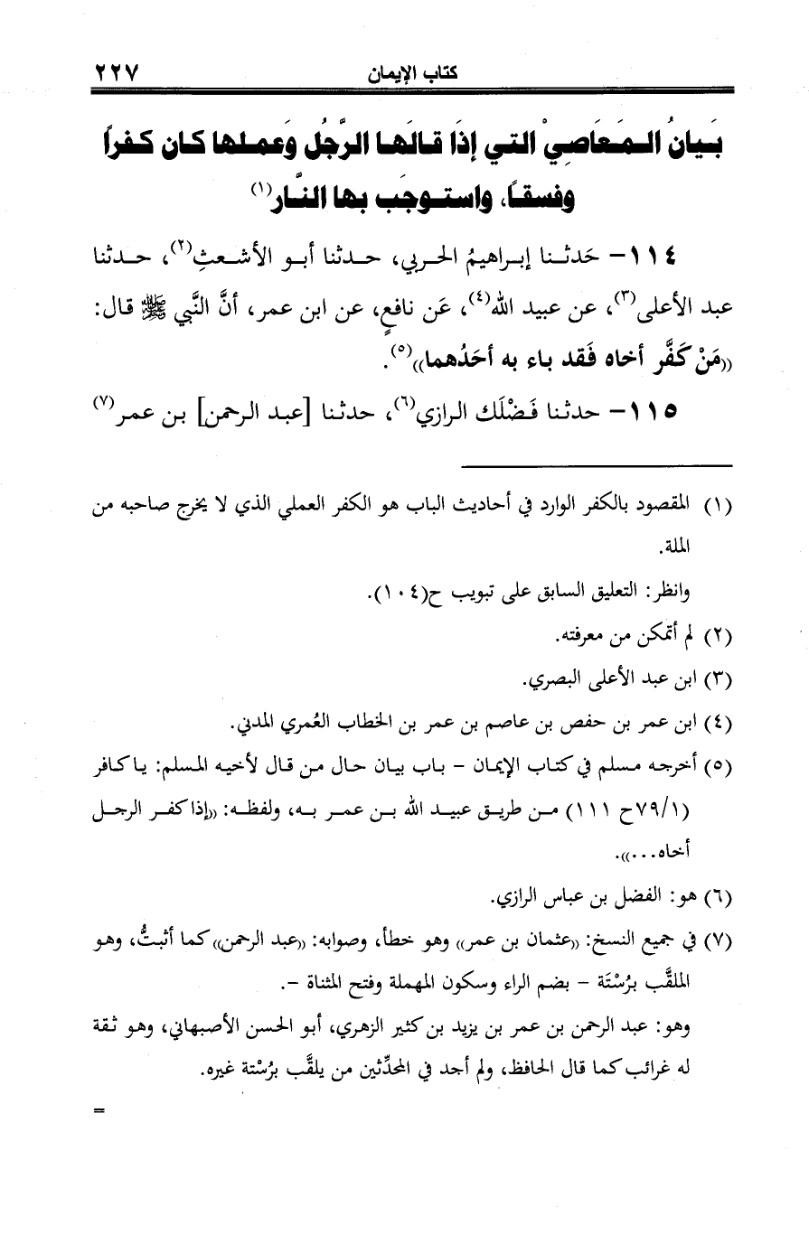 114 - حَدثنا إبراهيمُ الحربي، حدثنا أبو الأشعثِ (¬1)، حدثنا عبد الأعلى (¬2)، عن عبيد الله (¬3)، عَن نافعٍ، عن ابن عمر، أنَّ النَّبي -صلى الله عليه وسلم- قال: "مَنْ كَفُّر أخاه فَقد باء به أحَدُهما" (¬4).