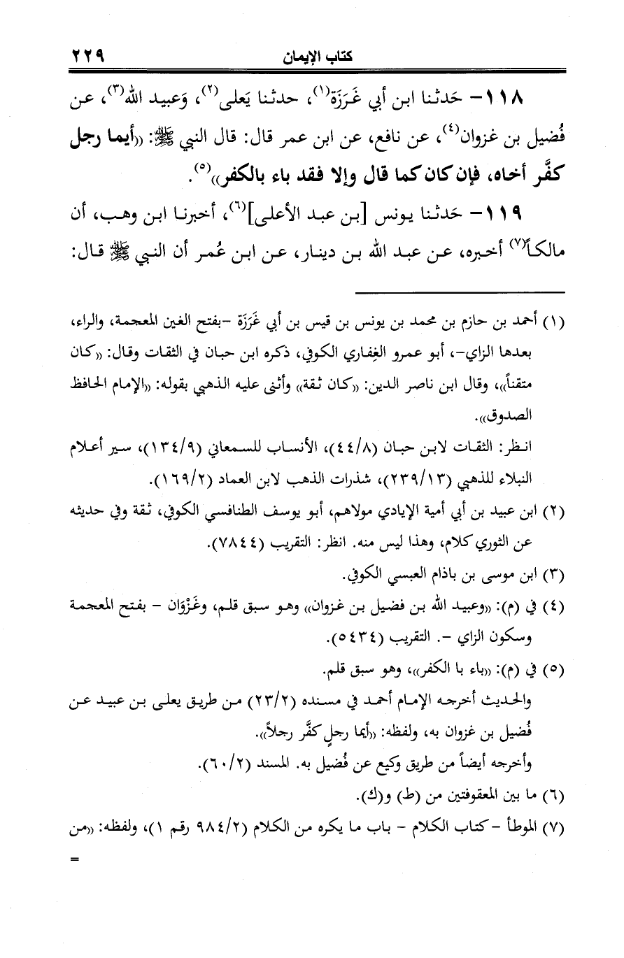 118 - حَدثنا ابن أبي غَرَزَة (¬1)، حدثنا يَعلى (¬2)، وَعبيد الله (¬3)، عن فُضيل بن غزوان (¬4)، عن نافع، عن ابن عمر قال: قال النبي -صلى الله عليه وسلم-: "أيما رجل كفَّر أخاه، فإن كان كما قال وإلا فقد باء بالكفر" (¬5).