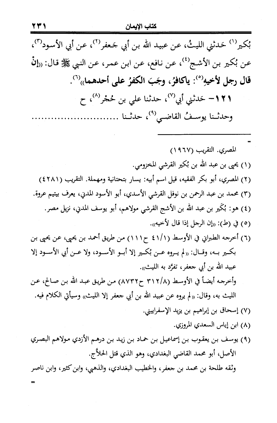 وَحَدثنا محمد [بن عبد الله] بن عبد الحكم (¬6)، حدثنا وهبُ الله (¬7)، حدثنا حيوة (¬8)، عن يزيد بن الهاد (¬9) كلاهما عن عبد الله بن دينار، عن ابن عمر قال: قال رسول الله -صلى الله عليه وسلم-: "أيما امرئ قال لأخيه: كافر، فقد باء بها أحدُهما إن كان كما قال، وإلا رجعَتْ عليه" (¬10).