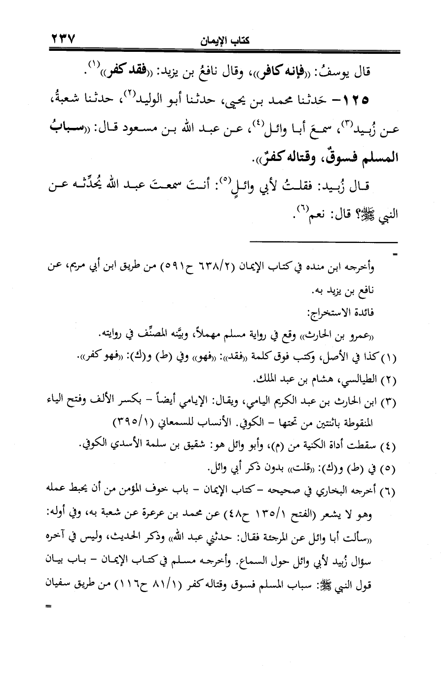 125 - حَدثنا محمد بن يحيى، حدثنا أبو الوليد (¬1)، حدثنا شعبةُ، عن زُبيد (¬2)، سمعَ أبا وائل (¬3)، عن عبد الله بن مسعود قال: "سبابُ المسلم فسوقٌ، وقتاله كفرٌ".