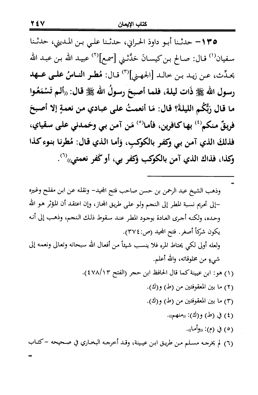 135 - حدثنا أبو داودَ الحراني، حدثنا علي بن المديني، حدثنا سفيان (¬1) قال: صالح بن كيسانَ حَدَّثني [سمع] (¬2) عبيد الله بن عبد الله يحدِّث، عن زيد بن خالد [الجهني] (¬3) قال: مُطر الناسُ على عهد رسول الله -صلى الله عليه وسلم- ذَات ليلة، فلما أصبحَ رسولُ الله -صلى الله عليه وسلم- قال: "ألم تَسْمَعُوا ما قال رَبُّكُم الليلةَ؟ قال: مَا أنعمتُ على عبادي من نعمةٍ إلا أصبحَ فريقٌ منكم (¬4) بها كافرين، فأما (¬5) مَن آمن بي وحَمدني على سقياي، فذلكَ الذي آمن بي كفر بالكوكبِ، وَأما الذي قال: مُطرنا بنوء كذا وكذا، فذاك الذي آمن بالكوكب وَكفر بي، أو كَفر نعمتي" (¬6).
