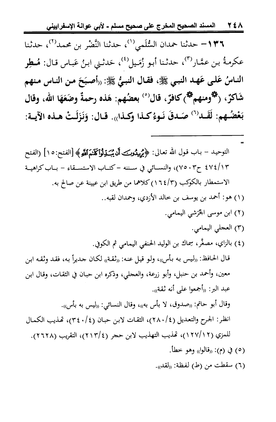 136 - حدثنا حمدان السُّلَمي (¬1)، حدثنا النَّضْر بن محمد (¬2)، حدثنا عكرمةُ بن عمَّار (¬3)، حدثنا أبو زُمَيل (¬4)، حَدثني ابنُ عَباس قال: مُطِر الناسُ عَلى عَهد النبي -صلى الله عليه وسلم-، فقال النبيّ -صلى الله عليه وسلم-: "أصبَحَ من الناس منهم شَاكرٌ، (*ومنهم*) كافرٌ، قال (¬5) بعضُهم: هَذه رحمةٌ وضَعَهَا الله، وقال بَعْضُهم: لَقَد (¬6) صَدقَ نَوءُ كذا وكذا". قال: وَنَزَلَتْ هذه الآية: