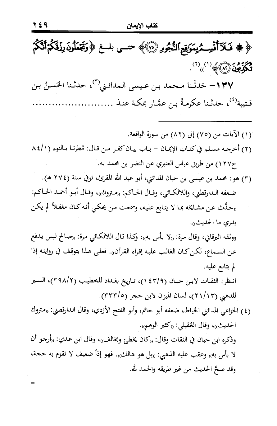 (¬1) هو: محمد بن عيسى بن حيان المدائني، أبو عبد الله المقرئ، توفي سنة (274 هـ).