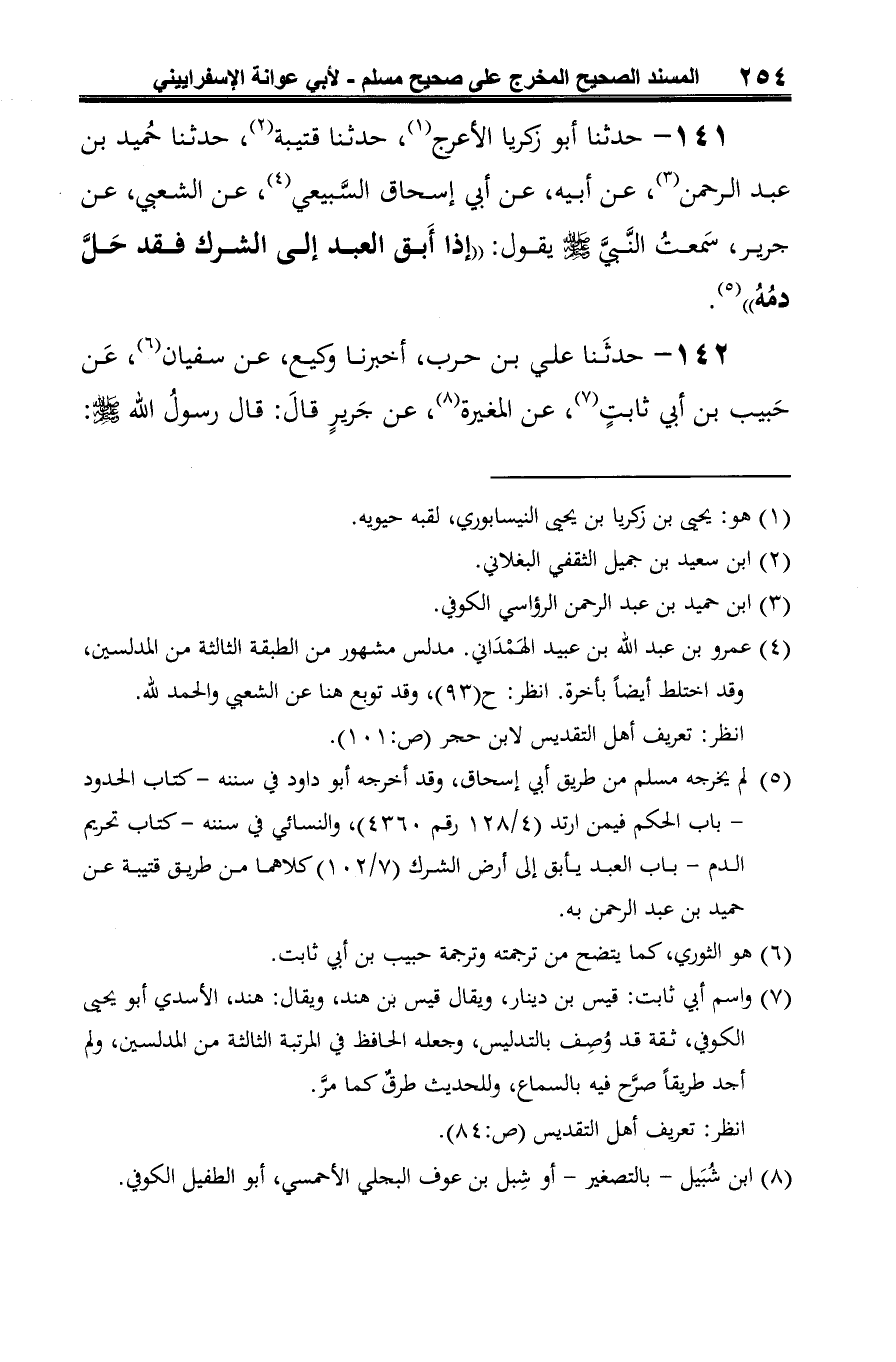 141 - حدثنا أبو زكريا الأعرج (¬1)، حدثنا قتيبة (¬2)، حدثنا حُميد بن عبد الرحمن (¬3)، عن أبيه، عن أبي إسحاق السَّبيعي (¬4)، عن الشعبي، عن جرير، سَمعتُ النَّبيَّ -صلى الله عليه وسلم- يقول: "إذا أَبق العبد إلى الشرك فقد حَلَّ دمُهُ" (¬5).