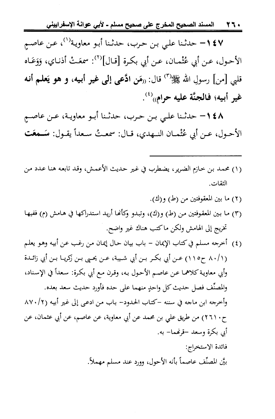 147 - حدثنا علي بن حرب، حدثنا أبو معاوية (¬1)، عن عاصمٍ الأحول، عن أبي عُثْمان، عن أبي بكرة [قال] (¬2): سمعَتْ أذناي، وَوَعَاه قلبي [من] رسولِ الله -صلى الله عليه وسلم- (¬3) قال: "مَن ادَّعى إلى غير أبيه، وهو يَعلم أنه غير أبيه؛ فالجنَّة عليه حرام" (¬4).