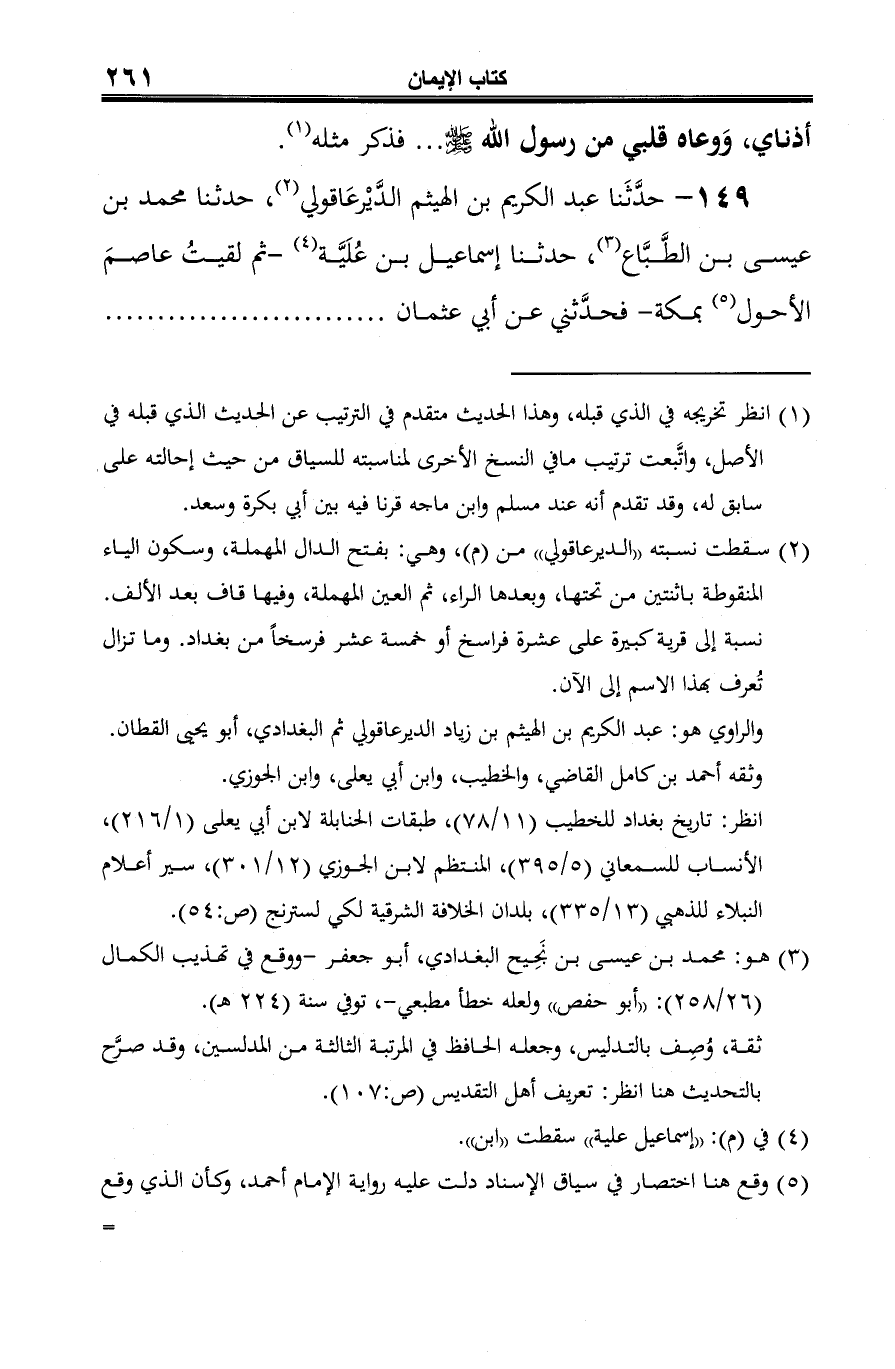 149 - حدَّثَنا عبد الكريم بن الهيثم الدَّيْرعَاقولي (¬1)، حدثنا محمد بن عيسى بن الطَّبَّاع (¬2)، حدثنا إسماعيل بن عُلَيَّة (¬3) -ثم لقيتُ عاصمَ الأحول (¬4) بمكة- فحدَّثني عن أبي عثمان