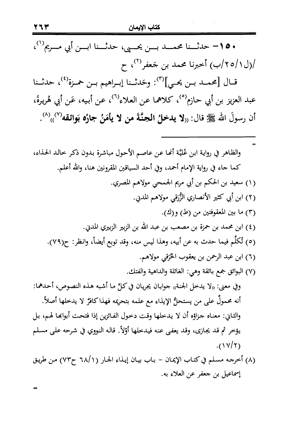 قال [محمد بن يحيى] (¬3): وحَدثنا إبراهيم بن حمزة (¬4)، حدثنا عبد العزيز بن أبي حازم (¬5)، كلاهما عن العلاء (¬6)، عن أبيه، عَن أبي هُريرةَ، أن رسولَ الله -صلى الله عليه وسلم- قال: "لا يدخلُ الجنَّةَ من لا يأمَنُ جارُه بَوائقه (¬7) " (¬8).