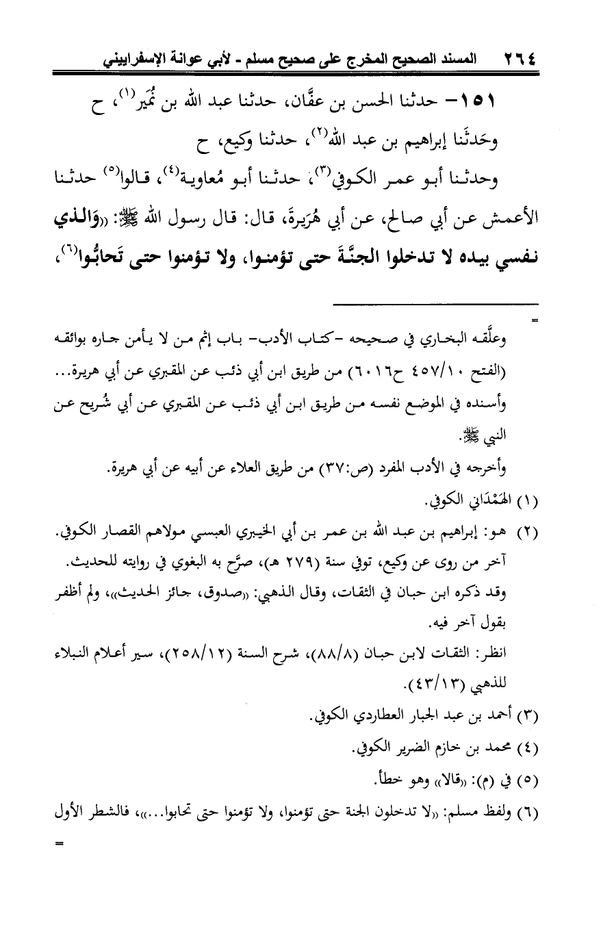 وحدثنا أبو عمر الكوفي (¬3)، حدثنا أبو مُعاوية (¬4)، قالوا (¬5) حدثنا الأعمش عن أبي صالح، عن أبي هُرَيرةَ، قال: قال رسول الله -صلى الله عليه وسلم-: "وَالذي نفسي بيده لا تدخلوا الجنَّةَ حتى تؤمنوا، ولا تؤمنوا حتى تَحابُّوا (¬6)،